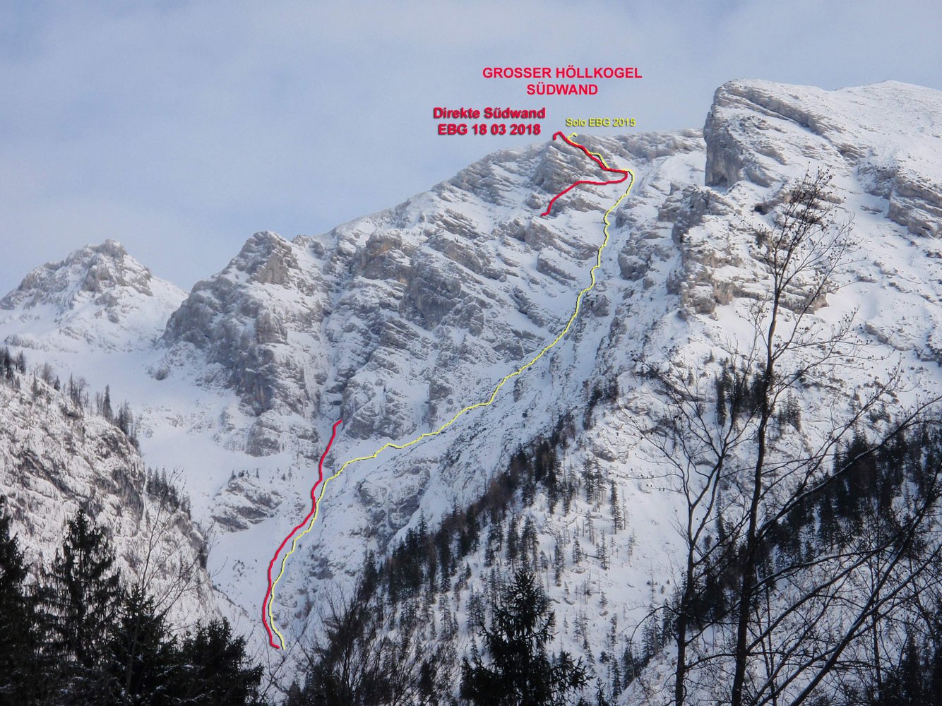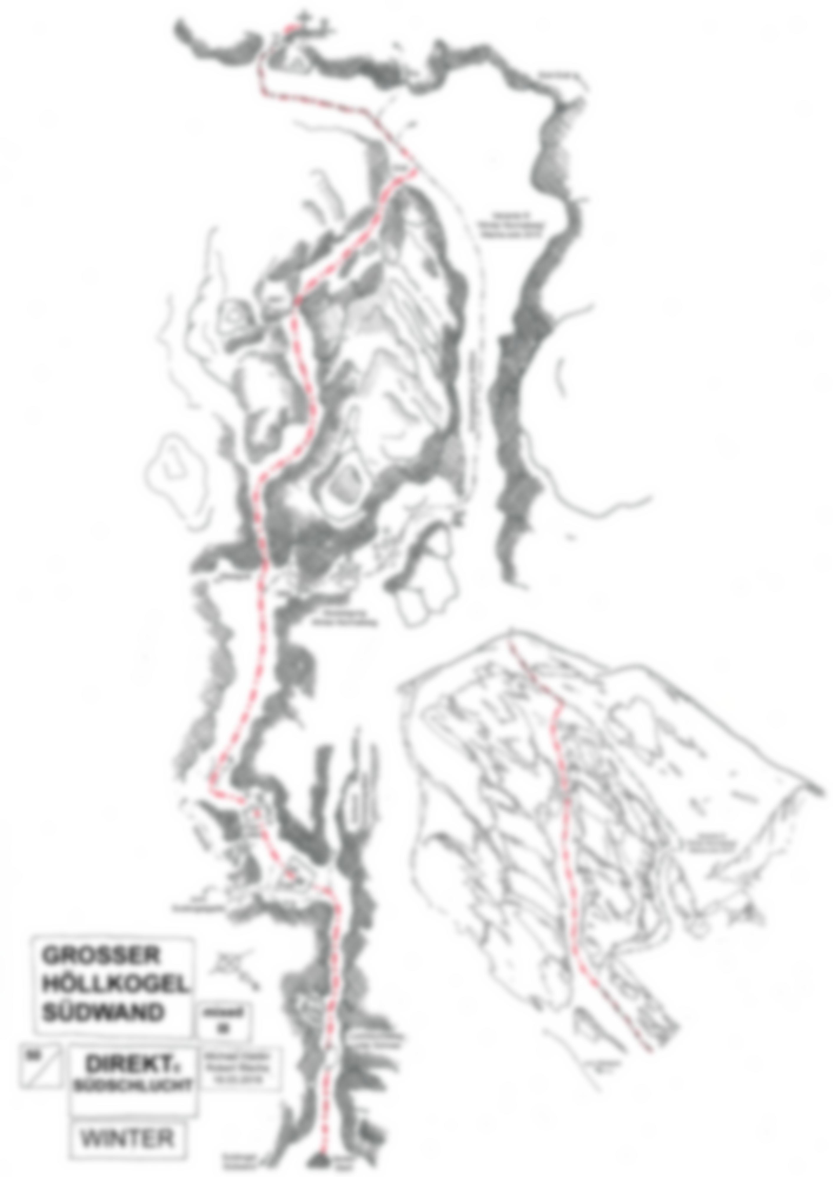 Eine Begehung der großen Höllkogel-Südwand unter winterlichen Bedingungen zählt zu den absoluten Highlights des Höllengebirges, ist aber aufgrund der komplexen Bedingungen ein nicht ungefährliches Unterfangen. Denn nur an wenigen Tagen im Frühjahr bildet sich vom Gipfel bis zum Höllkessel ein beinahe durchgehend begehbares Schnee/Eisband aus Lawinenschnee, welches sogar die „große Schlucht“ vollständig füllt. Mit wenigen Felsstellen bis III ist dann ein Durchstieg durch die gesamte Südwand bis zum Gipfel möglich.Achtung ! Es ist unbedingt auf die Schneeverhältnisse und den Taggang zu achten. Die Route ist im Winter extrem lawinengefährdet. Die gesamte Südwand entlädt sich genau entlang dieser Linie. An sonnigen Tagen sollte man bereits lange vor Sonnenaufgang starten und bis Mittag den Gipfel erreicht haben. Auch geringe Neuschneeauflagen ergeben bei Kälte aufgrund des großen Einzugs eine ausreichend tödliche Lawine und mit Stein- und Eisschlag ist in den Schluchten grundsätzlich zu rechnen. Die Felspassagen sind wenn nicht brüchig dann gefroren und lassen sich praktisch kaum absichern. Sie müssen mit Eisausrüstung oder mit bloßen Fingern und Bergstiefeln geklettert werden. Die Route ist teils ausgesetzt und verlangt seilfreie Moral."