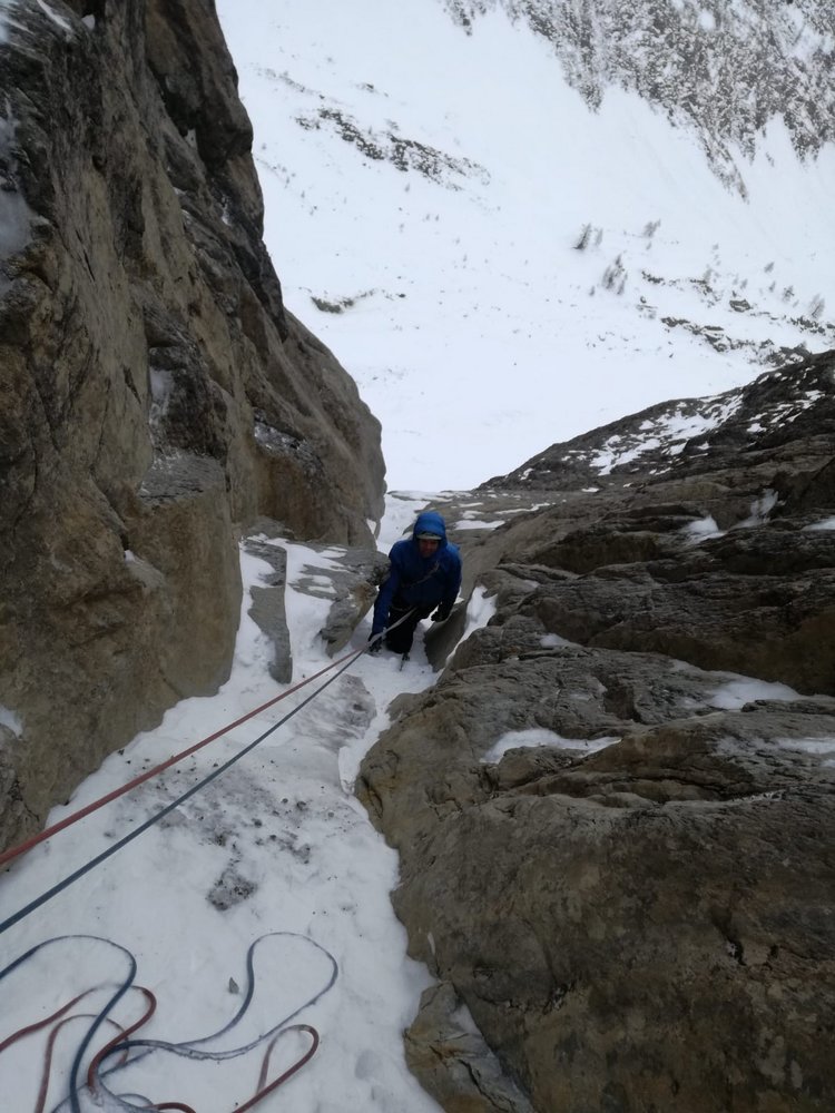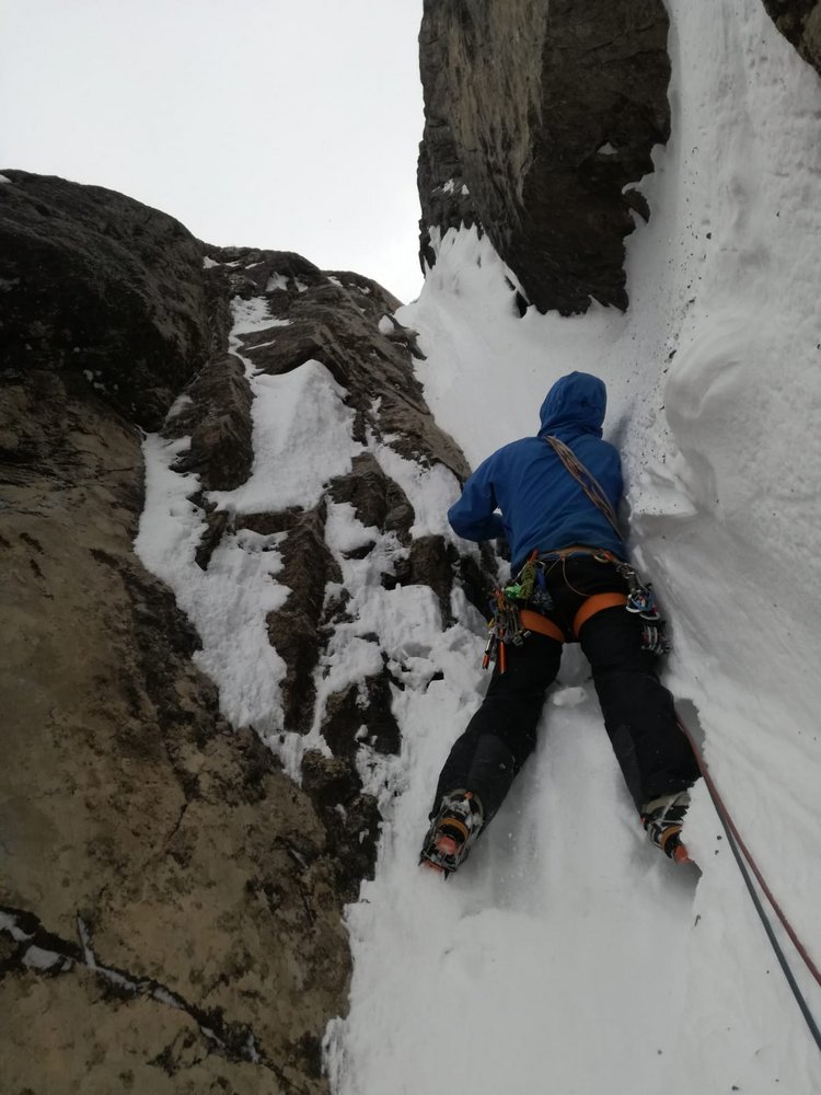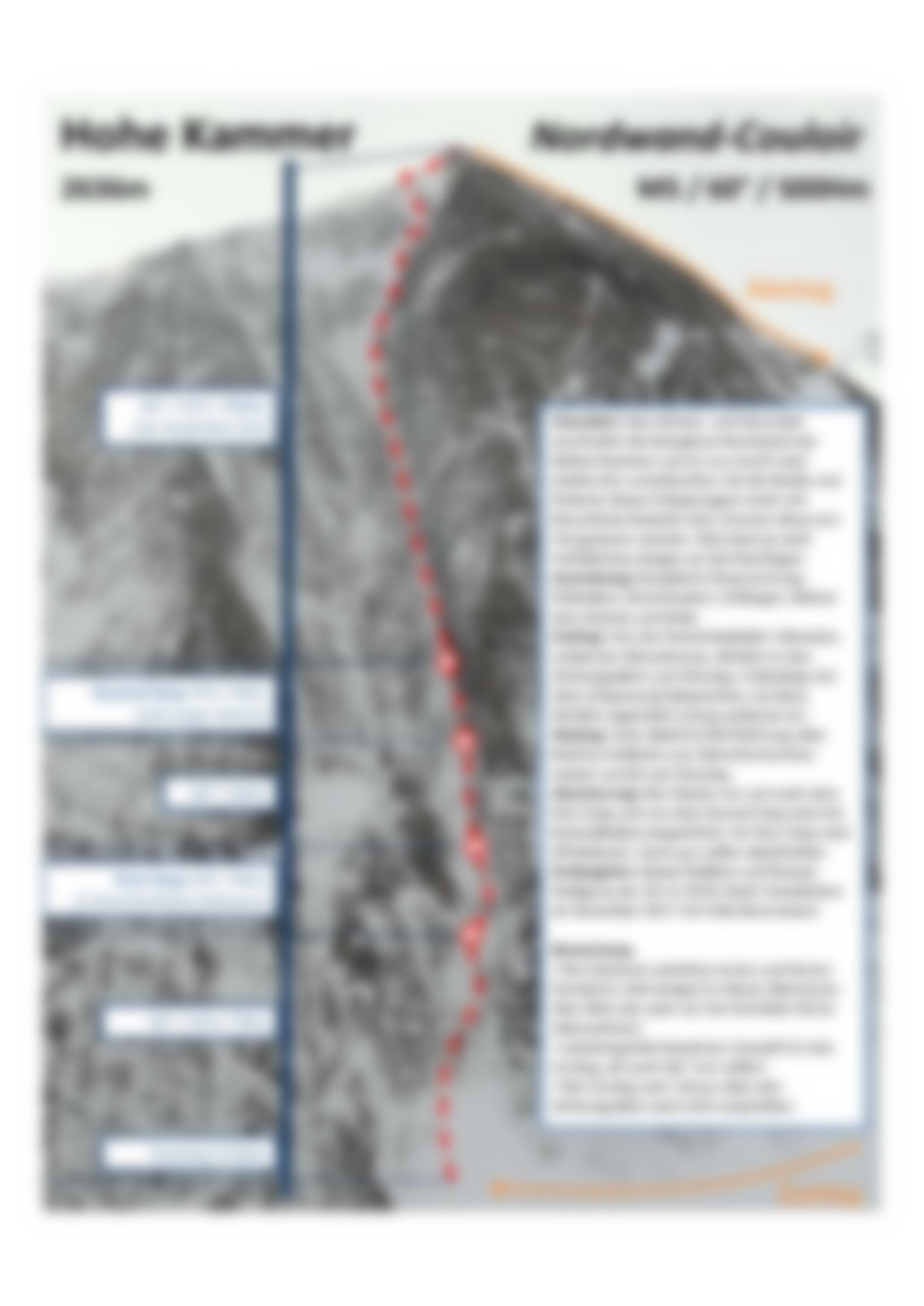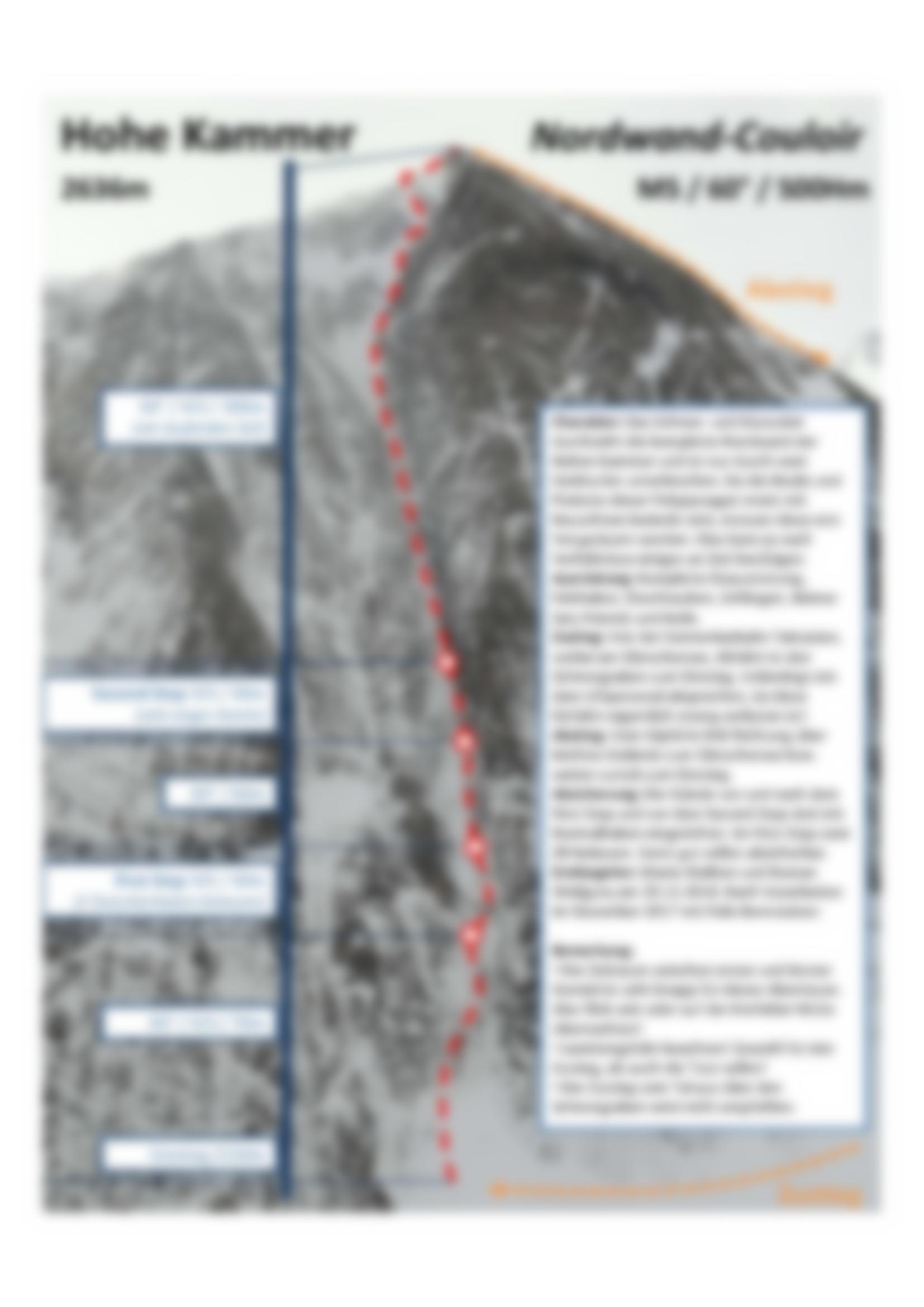Das Schnee- und Eiscouloir durchzieht die komplette Nordwand der Hohen Kammer und ist nur durch zwei Steilstufen unterbrochen. Da die Hooks und Podeste dieser Felspassagen meist mit Neuschnee bedeckt sind, müssen diese erst frei geräumt werden. Dies kann je nach Verhältnisse einiges an Zeit benötigen.