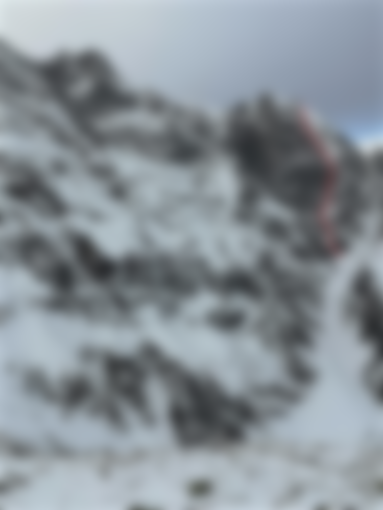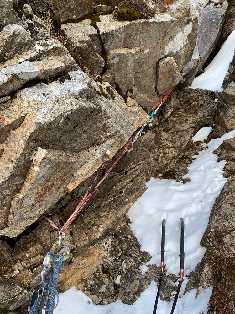 2. Dem Nordnordwestgrat folgend über Schnee und Platten bis kurz vor den Abbruch, der zur Scharte abfällt, von der nach Nordosten die markante Rinne zum Wandfuß abzweigt. An Abseilstand (Keil und NH belassen, mit Friend hintersichern) 25 m in die Scharte abseilen. Der Rinne abwärts nach Nordosten folgen. Ein weiterer eingerichteter Abseiler führt in leichteres Gelände.