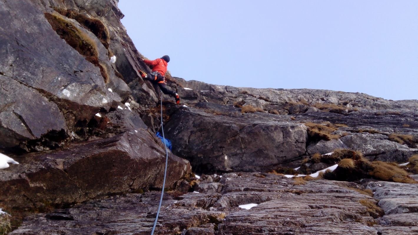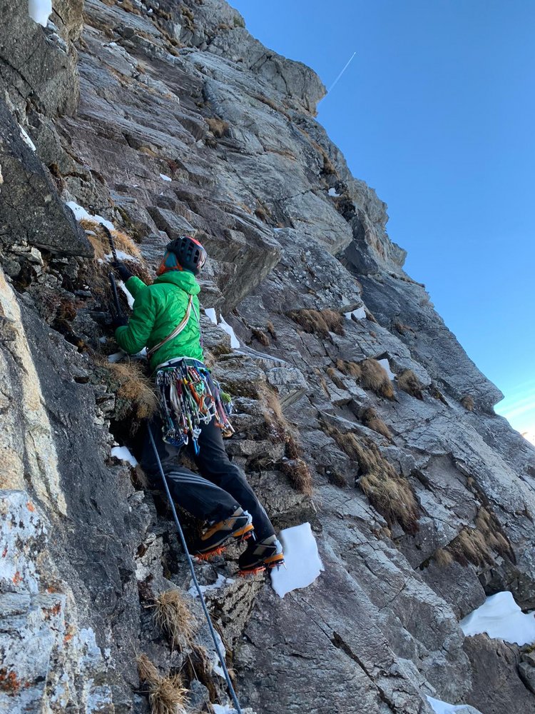 4. SL: 45 m, M6 bzw. 6+/7-. Lange, teils überhängende Seillänge in der Verschneidung. Mischung aus Drytooling und Klettern ohne Handschuhe (Bewertung je nach Stil und Verhältnissen). Stand in Nische in gelbem Fels an belassenem Klemmkeil und Friend oder an zwei Messerhaken (selbst schlagen).