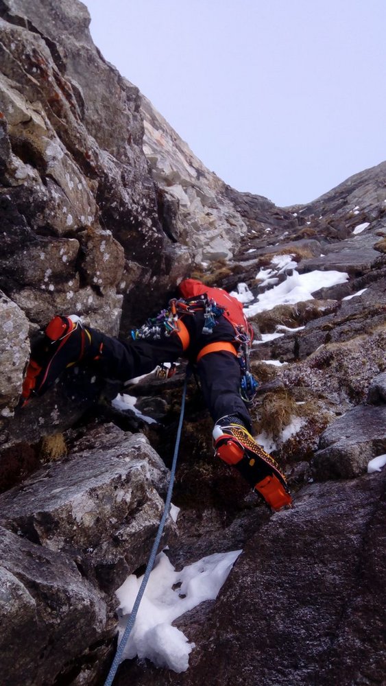 3. SL: 30 m, M4. Über Schnee und Platten rechtshaltend in die Verschneidung, Stand an Klemmblock.