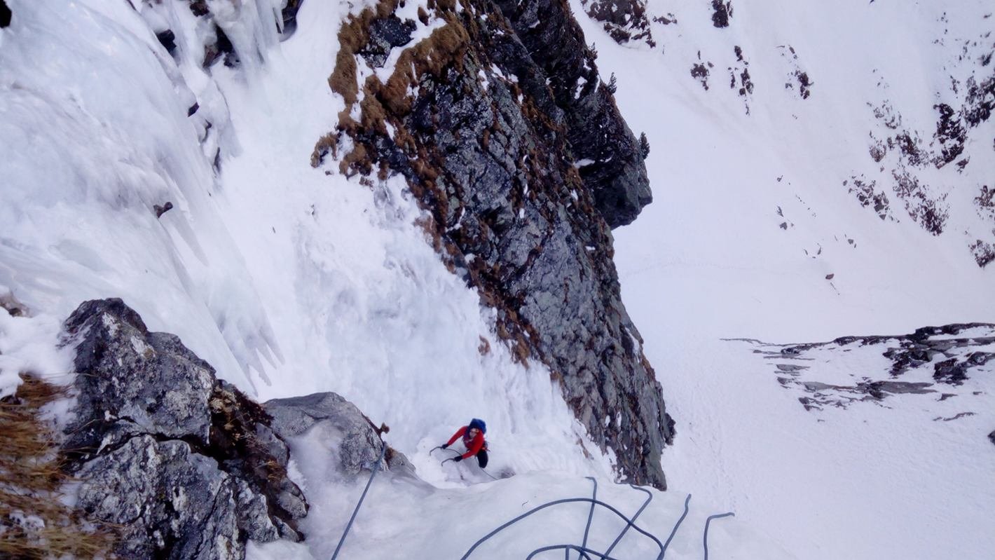 1. SL: 40 m, WI4+. Der offensichtlichen Eisspur bis zu deren Ende folgen. Stand im Eis.