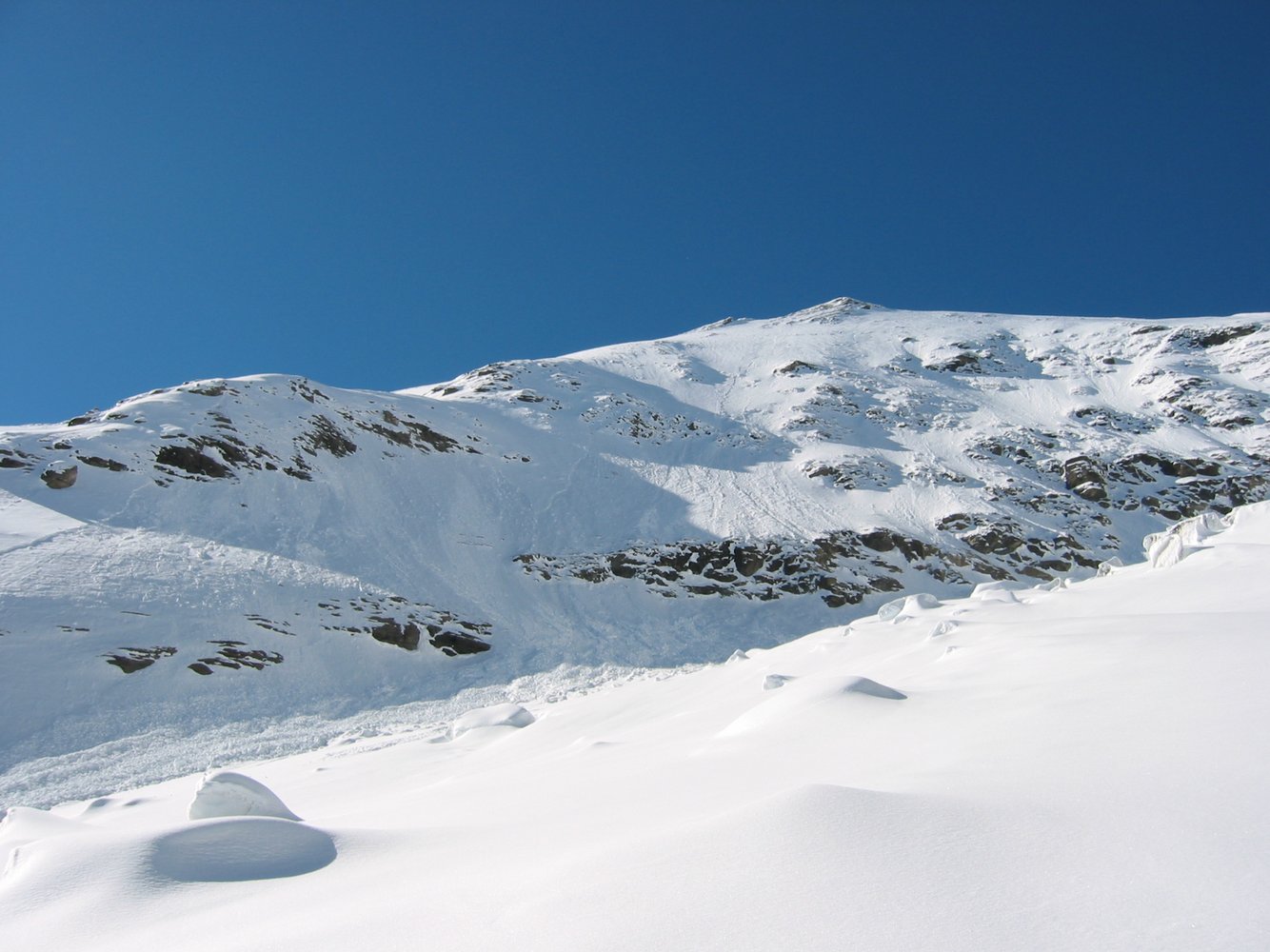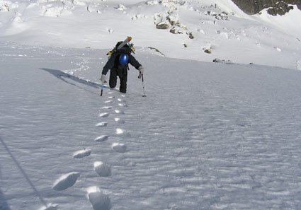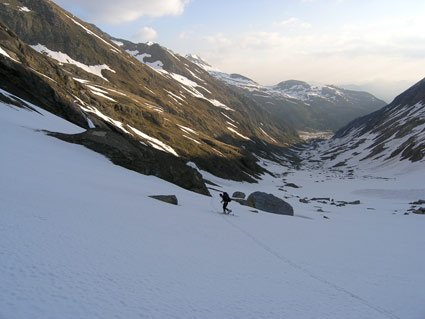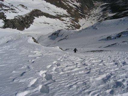 Lange aber leichte Firnwand, die vom Tal aus sehr anstrengend (2500 Hm) ist. Besser Heulager/Biwak auf der Hirzbachalm (bitte alles so lassen wie es ist und keinen Müll zurücklassen).