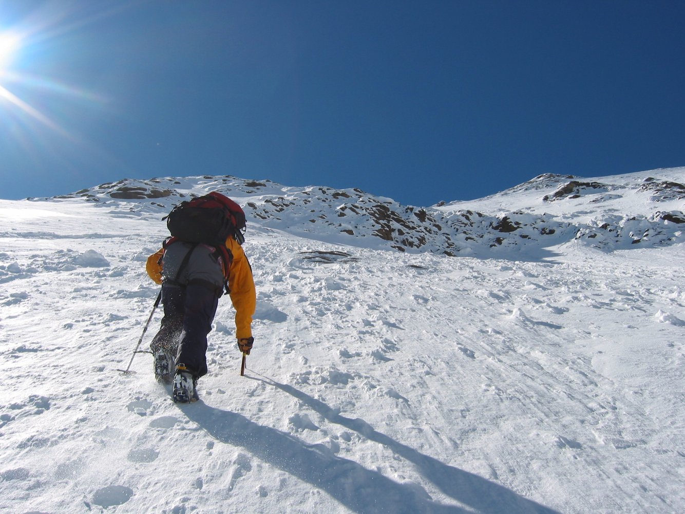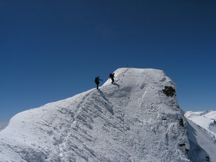 Steigeisen, Pickel und Ski (Ski sind für Zu- und Abstieg nötig).