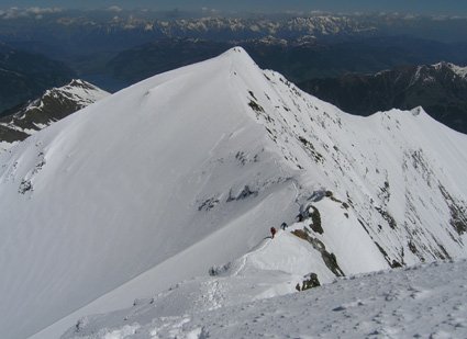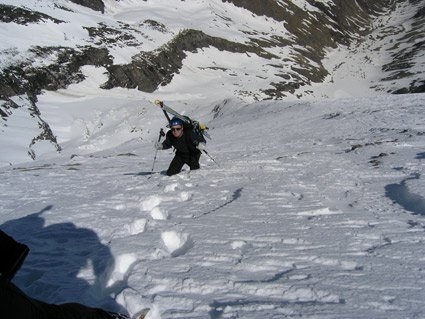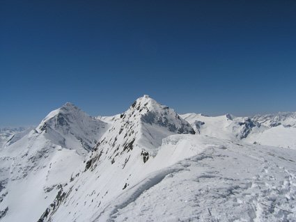 Vom Einstieg entweder von links zur Engstelle hinauf queren oder unten, direkt über den kleinen Felsgürtel. Die Engstelle in Wandmitte ist bei genügend Schneelage unschwierig, danach noch ca. 40° Hänge bis die Wand vor dem Gipfel dann wieder flacher wird. Man steigt leicht links vom Schneespitz aus, dann folgt noch ein langer Grat zum, um 50 Meter höheren, Hauptgipfel.