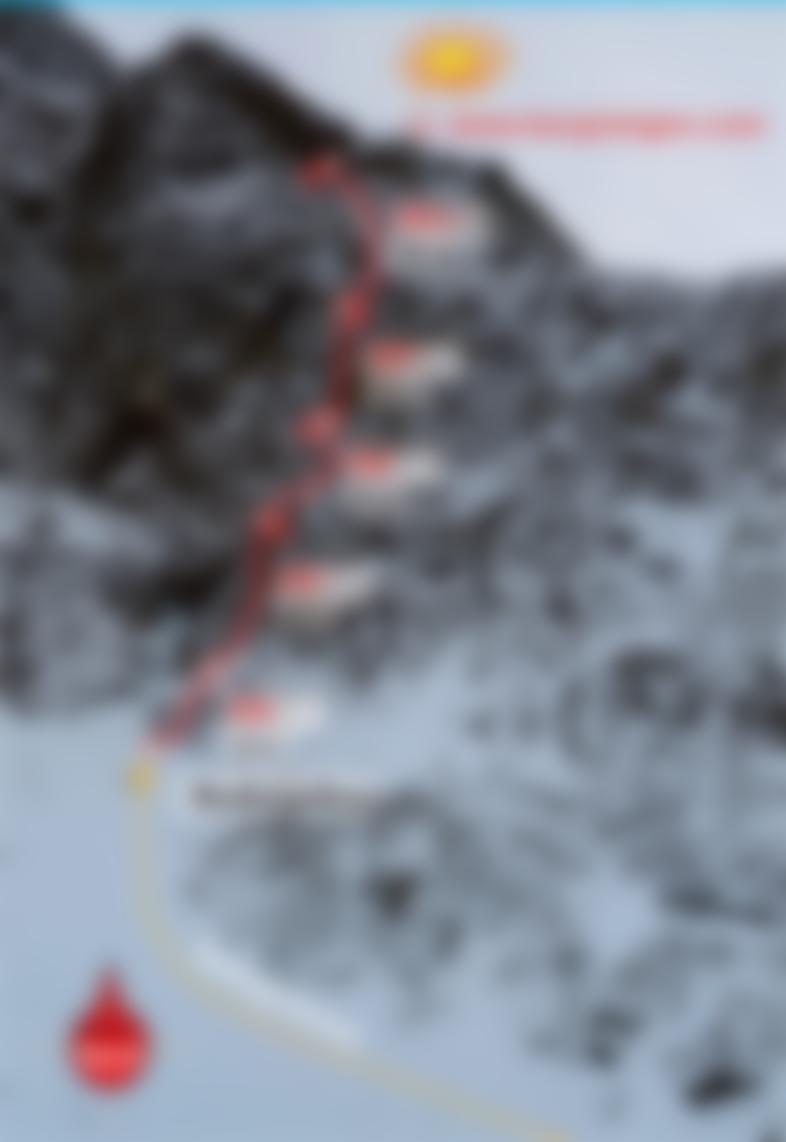 1. Seillänge (25 m, M4): Gerade aufwärts an Mixedgelände höher, man sieht den ersten Bohrhaken ca. in 15 m Höhe. Danach über eine Minischneefeld nach links zum Standplatz.