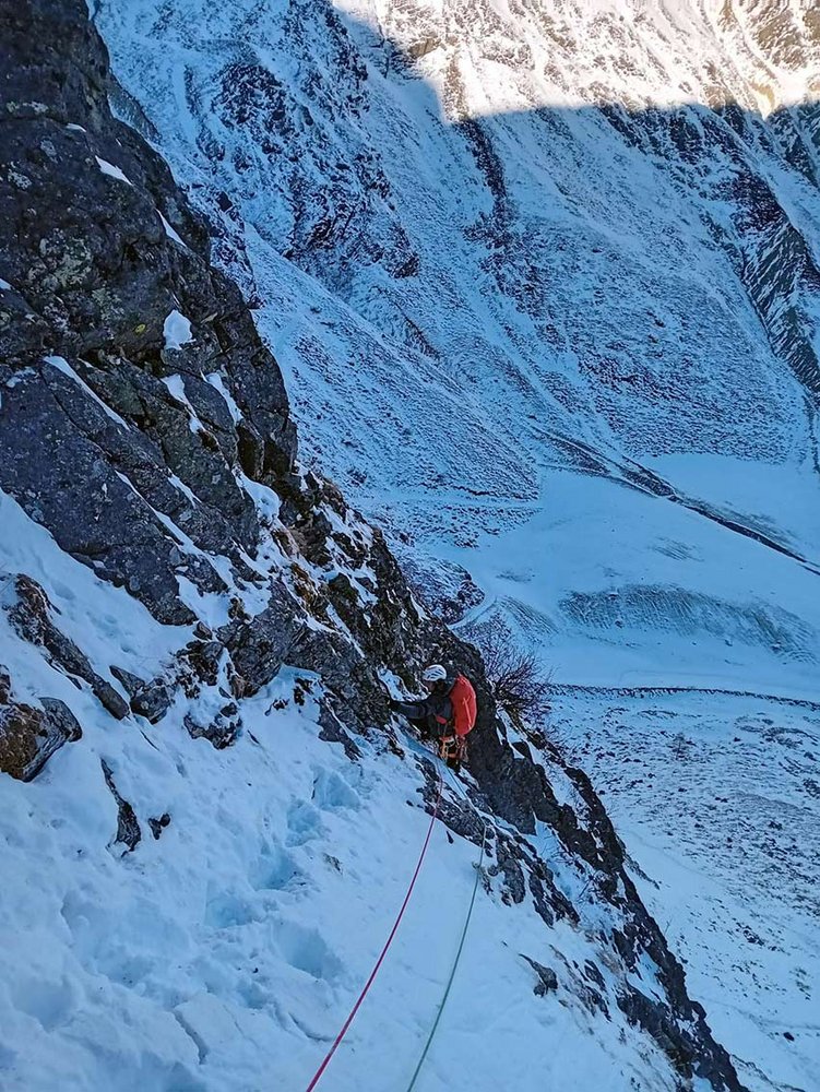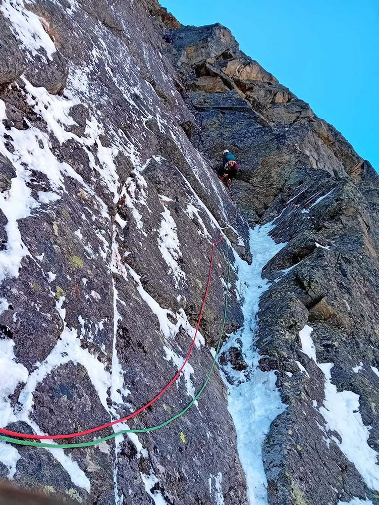 3. Seillänge (35 m, M5): Auf einem Band (Schnee) quert man ca. 10 Meter nach rechts, dann an plattigem Fels vorbei an 2 Bohrhaken zum nächsten Band (Schnee). Dort links und über einen Aufschwung (Bohrhaken) zum Standplatz.