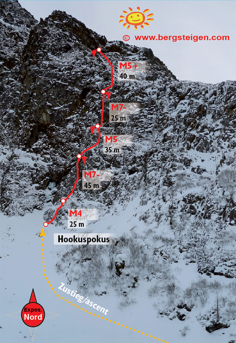 Die Route Hookuspokus ist eine Mixedkletterei an der Burgschrofen Felswand links von der ersten Zwinge im Kraspestal. Wie bei den anderen Toure überwiegt Fels- und Graskletterei. Der Anstieg verläuft links der Route "Dornröschen". Die Route ist etwas anspruchsvoller und steiler als die rechten Touren. Die Route Hookuspokus ist an den schwierigen Passagen mit Bohrhaken gesichert (dazwischen muss aber zwingend geklettert werden), man benötigt aber trotzdem eine Satz Cams. Man kommt am besten bei Temperaturen unter dem Gefrierpunkt und gesetztem Schnee - nur bei diesen schottischen Verhältnissen hat man Spaß.