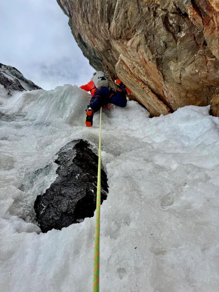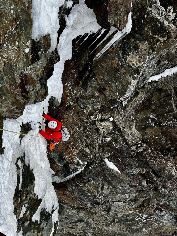 Seillängen 4–5: Steilere Passagen mit senkrechtem Eis und Fels, Schwierigkeit bis M5