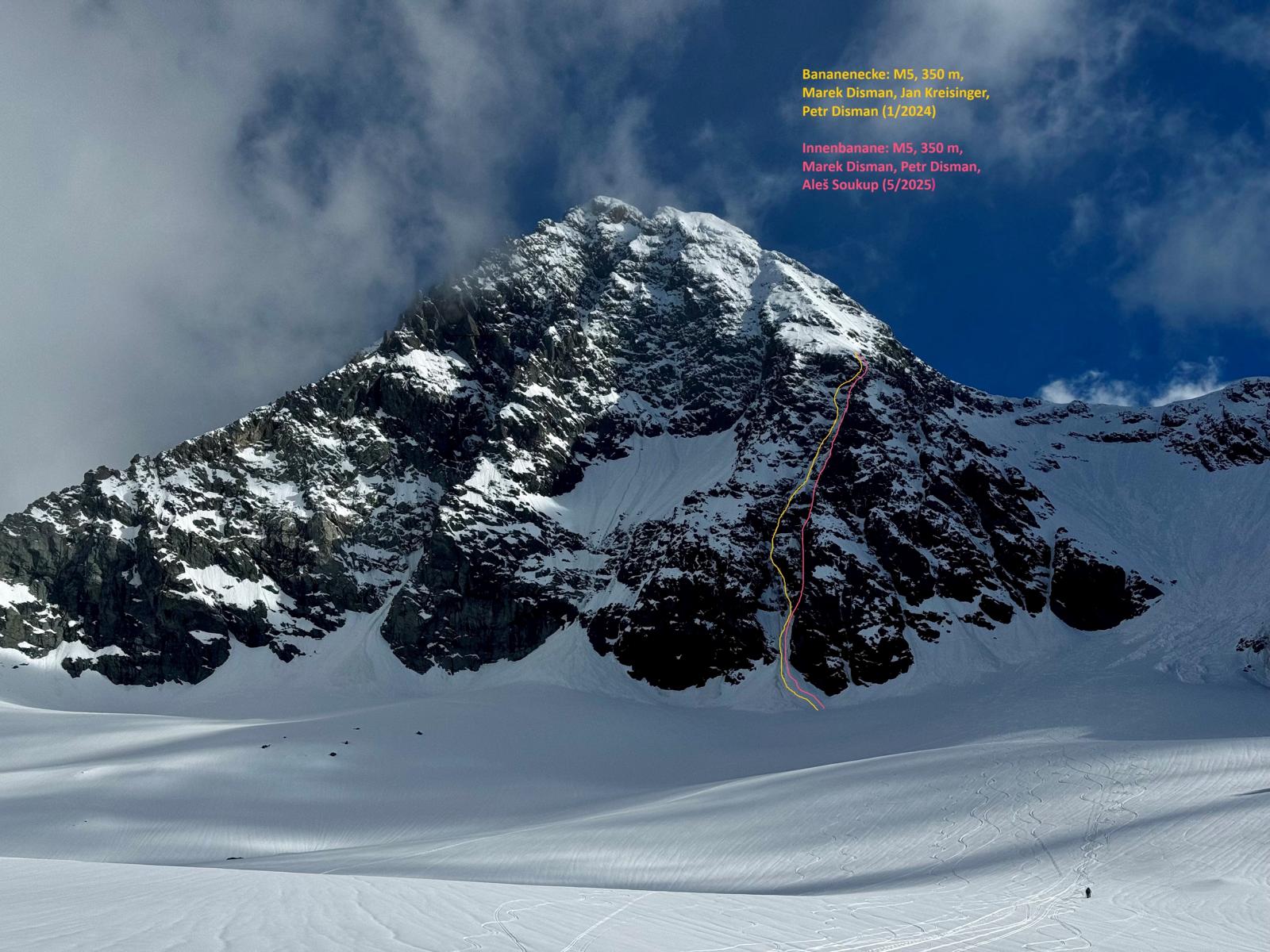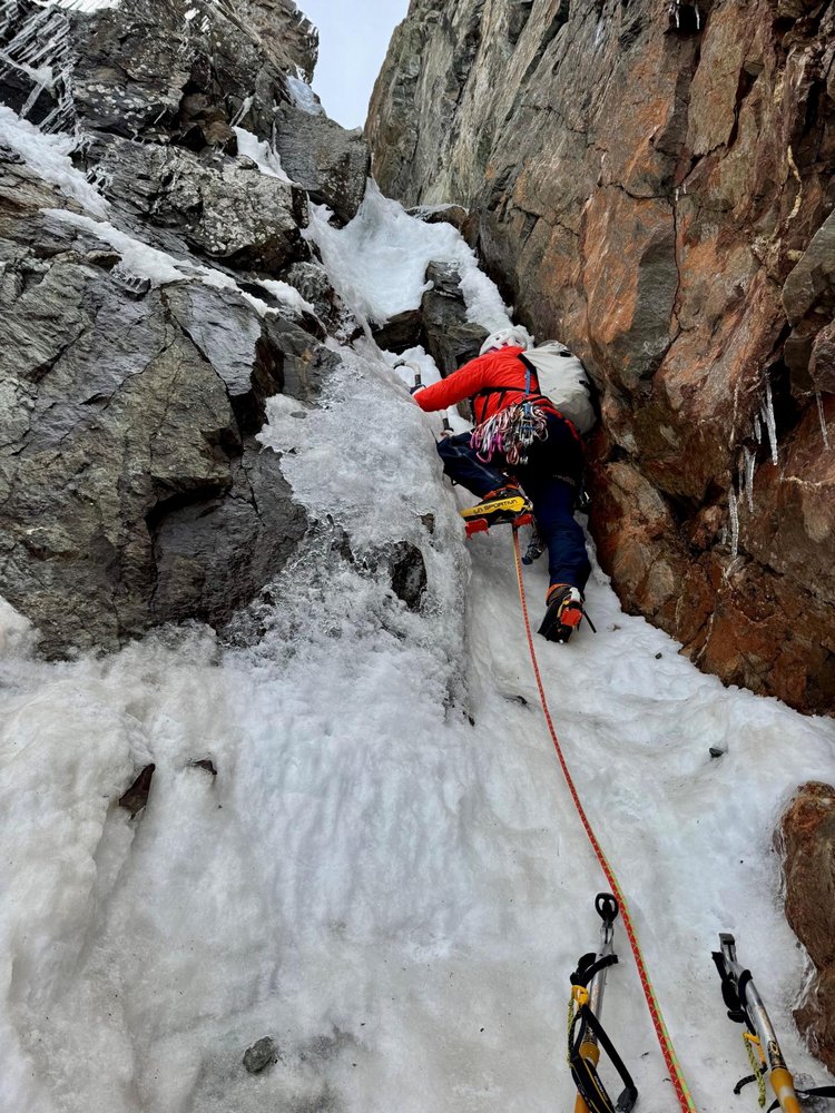 Die Route beginnt am Fuß eines markanten Schneekegels. Über diesen steigt man an, quert rechts über eine Randkluft in eine Verschneidung und folgt anschließend einer logischen Linie entlang dieser Verschneidung.
