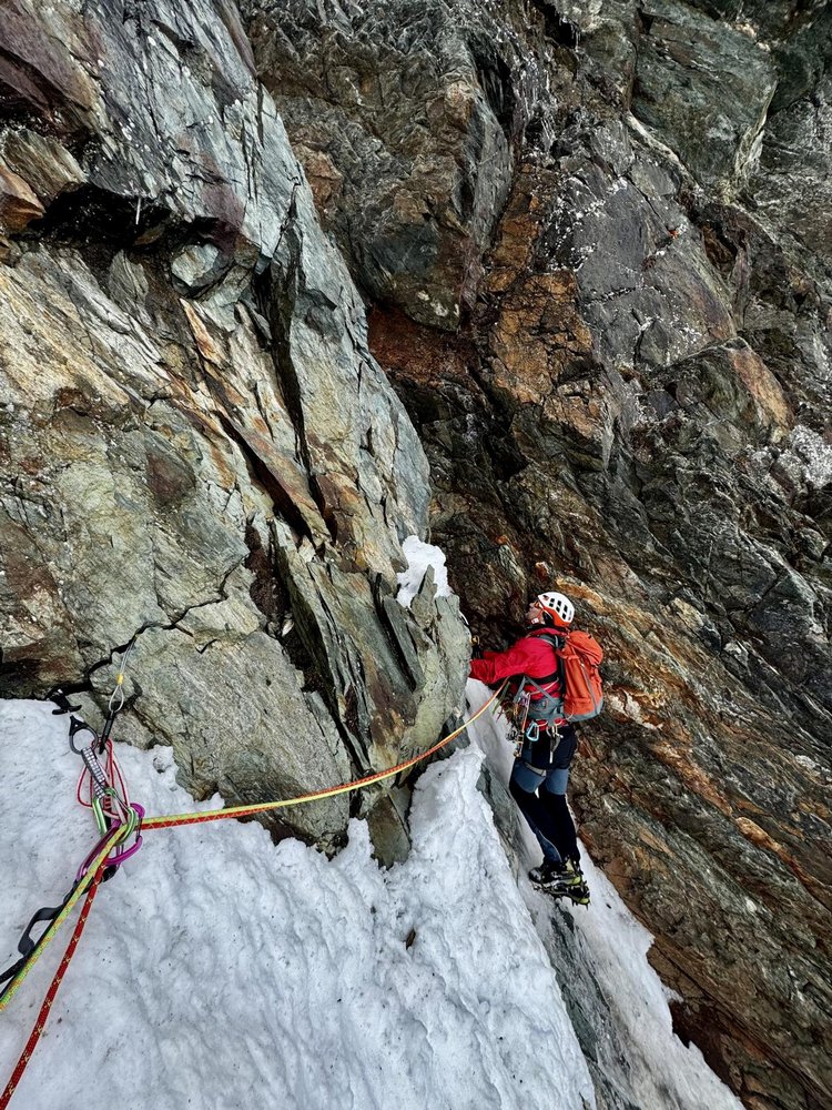 Seillängen 6–7: Moderater Schnee-/Eisrinnenanstieg, dann über eine Felsstufe zu einem großen Schneefeld in der Südostwand, wo die Route endet.