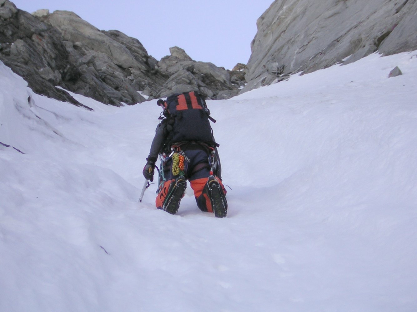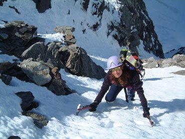 Die objektiven Gefahren sind bei diesem Eisanstieg sehr hoch, vor allem in der verdeckten Firnrampe ist man dem Steinschlag sehr ausgesetzt, weshalb sehr früh und nur bei tiefen Temperaturen eingestiegen werden soll !