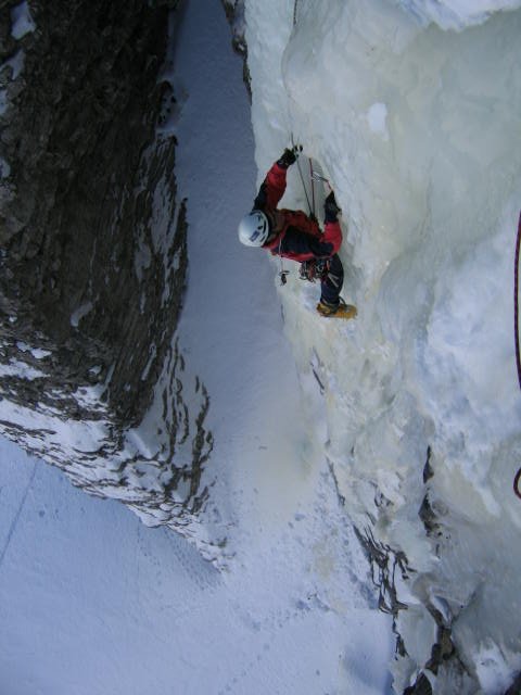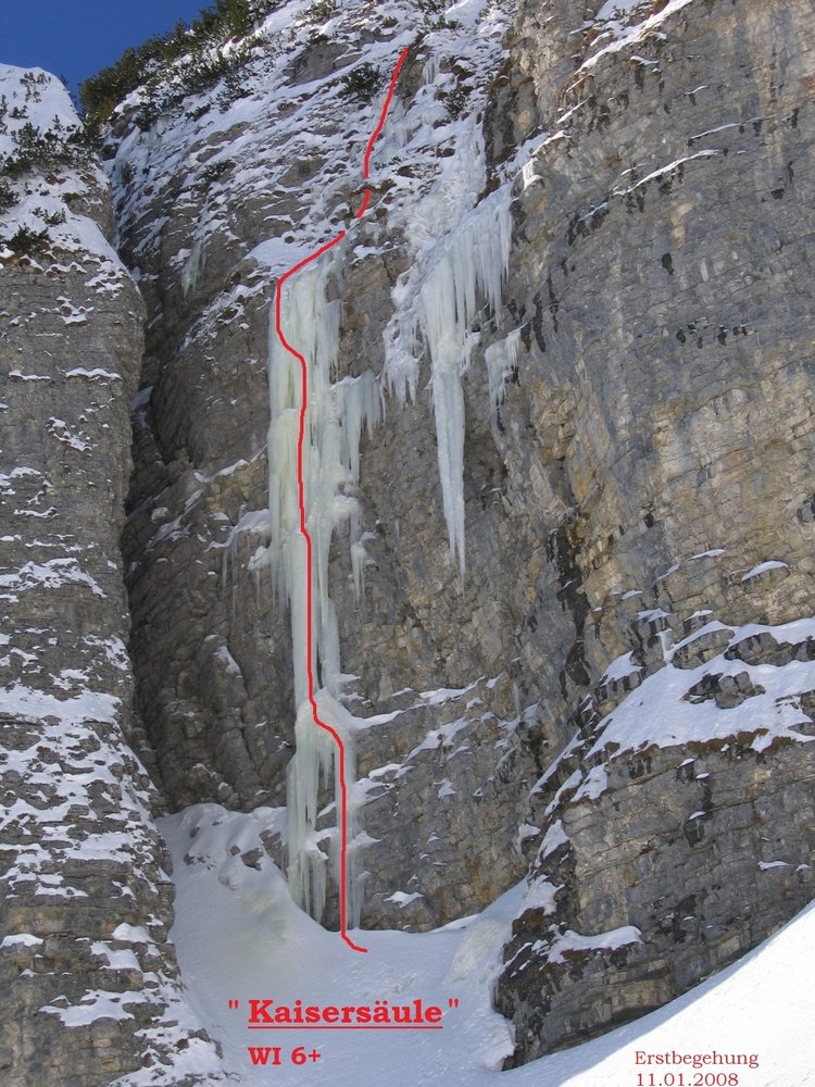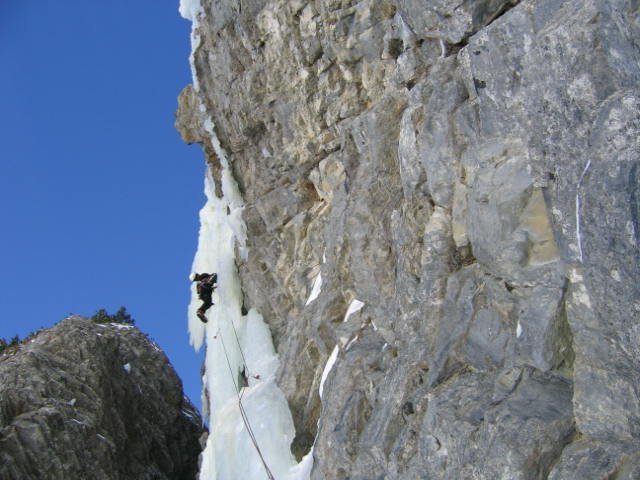 Bei der Erstbegehung war die Säule bis zum Einstieg gewachsen und es war eine reine Eistour, Absicherung mittells Eisschrauben. Wenn dies nicht der Fall ist, ist der untere Bereich Mixedgelände (nicht eingebohrt, Schwierigkeit nicht bekannt).