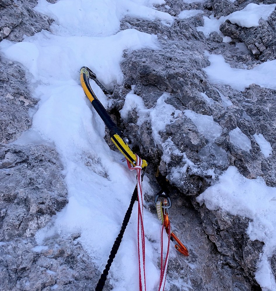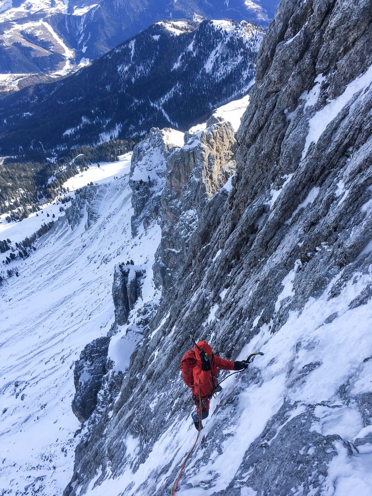 Anspruchsvolle und schwierig zu sichernde Mixed Route in der Peitlerkofel Nordwand über eine imposante Eisspur.