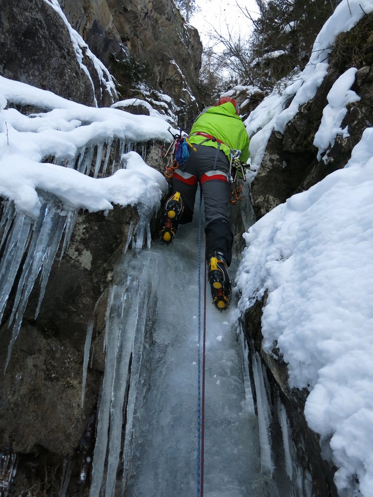 Leichter, schmaler Eisgully beim Klettergarten in Oberried. Die Tour ist meist WI2, eine Steilstufe hat aber ca. WI3. Der Anstieg durch den Gully ist 50 m lang.