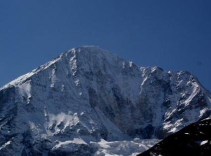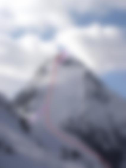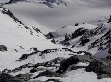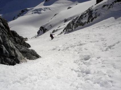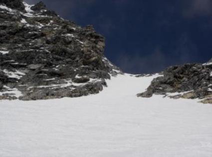 steilt sich diese zunehmend auf. Neigung nun meist zw. 40 bis 45 Grad. An der engsten Stelle, welche von der Hütte schon als solche zu erkennen ist, ist diese auf etwa 5m nur ca. 2,5m breit. Über dieser Engstelle ein wieder breiterer Hang. Am Ende nach links über die Schneekante in flacheres Gelände (1,5h ab Beginn der eigentlichen Rinne). Nun ansteigend nach links queren (etwa 35 Grad) zum Gipfelhang. (Diese Querung schaut in der Draufsicht von der Hütte steiler aus als sie ist).