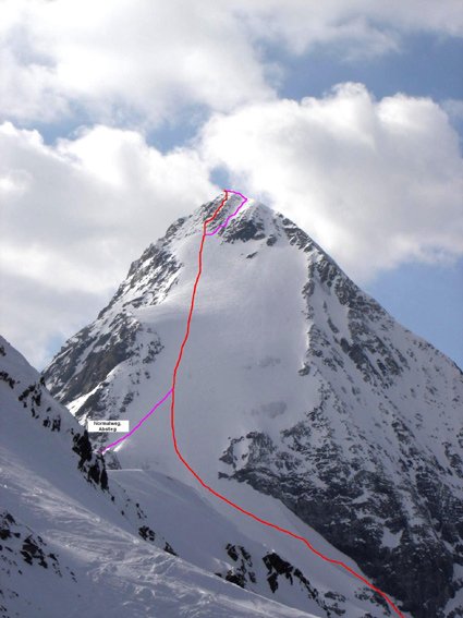 Mit Weg über die Casatihütte großzügige Hochtour (1850Hm, davon müssen bei Skibenützung diese über 1000Hm getragen werden) welche auch beim Abstieg/Abfahrt über den Normalweg hohe Anforderungen an das Skifahrerische Können stellt.