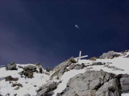 Nun je nach Verhältnissen entweder direkt zum Gipfelkreuz hoch über eine kleine steile Rinne (oft wenig Schnee) oder etwas rechts davon über eine weitere Rinne zunächst zum Grat hoch (Vorsicht Wächte über die Nordwand) und an ihm in 50m nach links entlang zum Gipfelkreuz (1,5h ab Querung, bzw 3-3,5h ab Rinnenbeginn, 4-4,5h ab Schaubachhütte).
