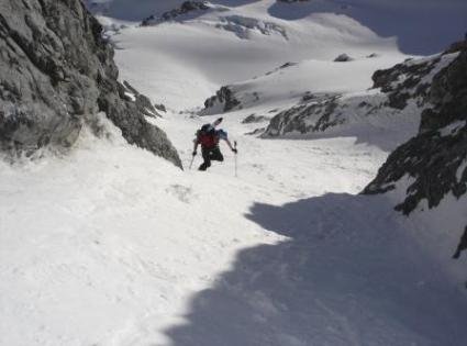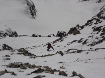 Diese Tour sollte allerdings nur bei ausreichend Schnee in der Rinne durchgeführt werden, da bei Ausaperung loses Geröll hervorkommt. Bei wenig Schnee und Vereisung moderate Eistour welche dann erheblich mehr Zeit in Anspruch nehmen kann. (dann evtl. auch Sichern notwendig)