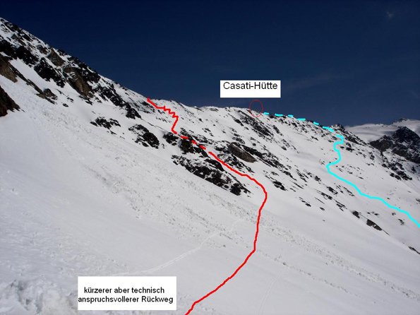 Diese Abfahrt ist allerdings nur sehr guten Fahrern anzuraten, denn wer stürzt kann hier sehr weit und vielleicht das letzte Mal stürzen. Man sollte sich nicht von den etwas leichtfertigen Aussagen des Hüttenwirtes, welcher gerne die Abfahrt empfiehlt, über die Schwierigkeiten täuschen lassen. Bei Aufstieg über die Rinne kann dann ja jeder sehen wie die Verhältnisse in der Rinne sind und ob man sich die Abfahrt zutraut. Diese ist jedoch ein besonderer Genuß. Zum einen ist man sehr schnell wieder im Tal, zum Anderen ist sie technisch anspruchsvoll und daher reizvoll. Trotzdem sollte in der Zeitplanung der um etwa 3h längere Weg über die Casati-Hütte von Anfang an eingeplant werden.