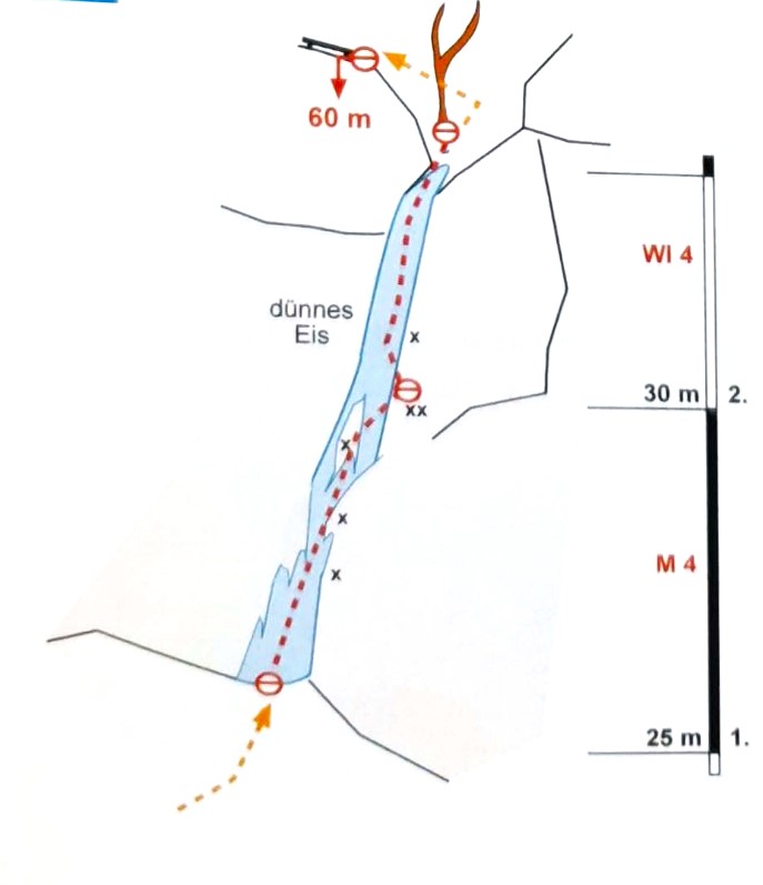 Eisausrüstung und 60 Doppelseil, Helm. Für den Vorstieg kurze Eisschrauben und/oder Felshaken.