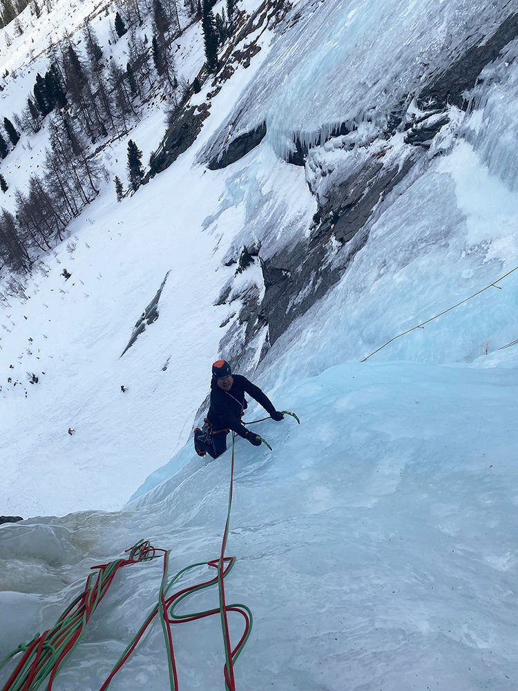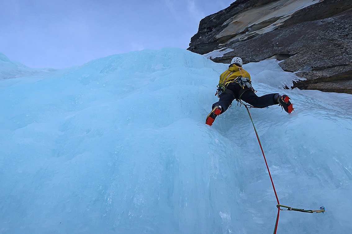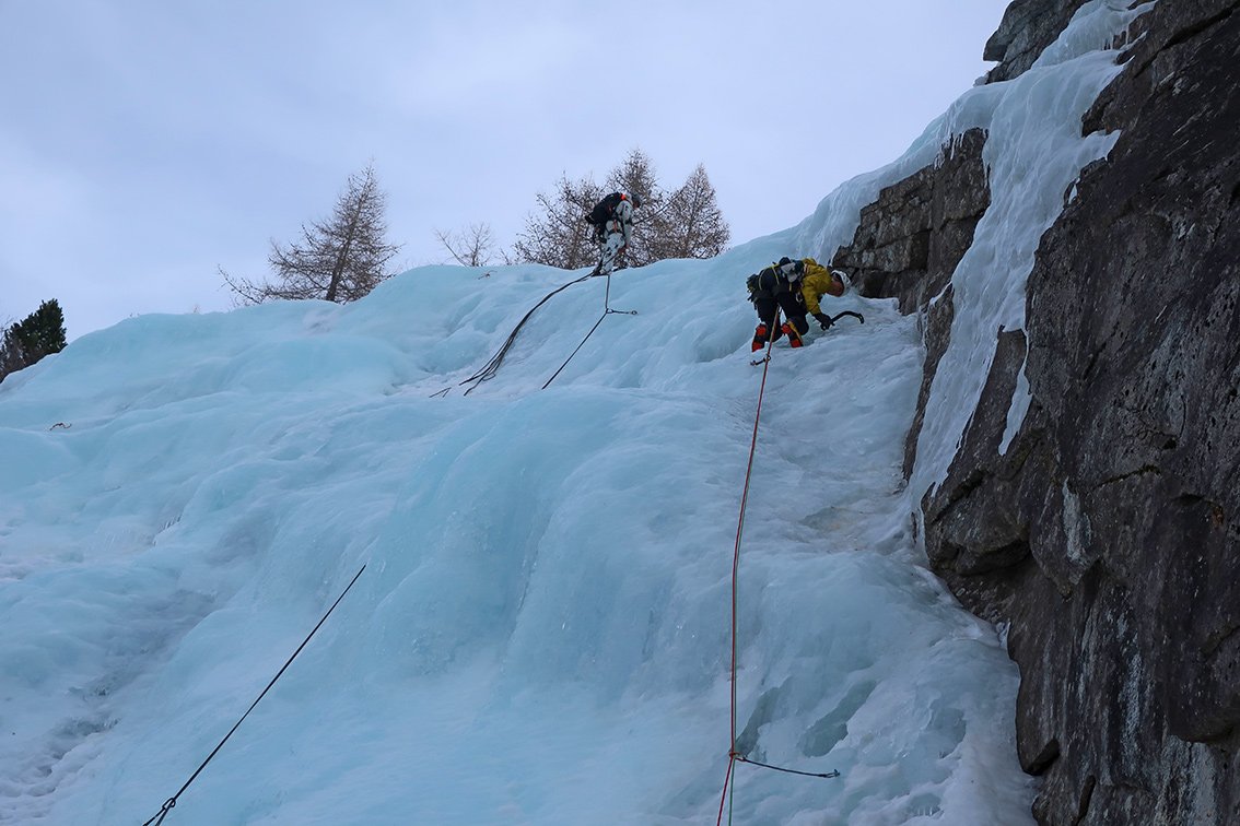 Über die Tour abseilen. Am rechten Rand gibt es eingerichtete Bohrhaken-Standplätze an den Felsen (oft sind aber im Fall sichtbare Abalakov-Schlingen zum Abseilen vorhanden).