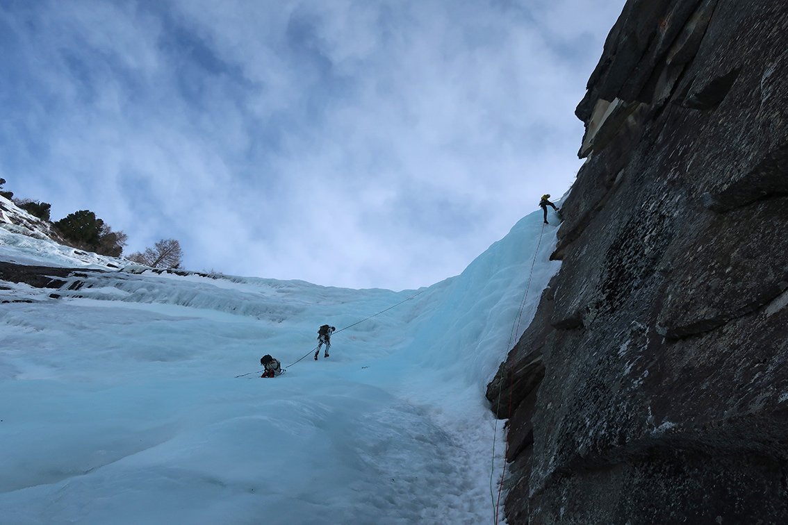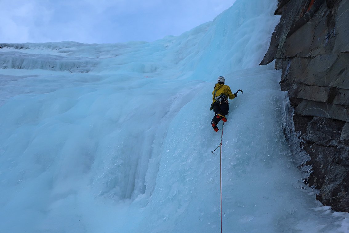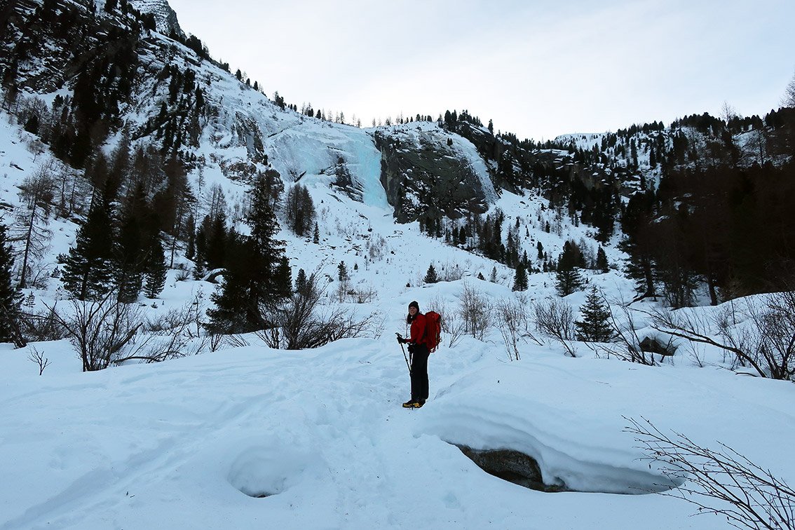 Der Ursprung Eisfall ist eines der beliebtesten Eisfälle im Reintal und ein echter Klassiker. Der Fall hat wegen seiner Höhenlage meist gute Eisverhältnisse - dementsprechend ist der Eisfall auch stark frequentiert (auch von Ausbildungskursen). Im rechten Teil klettert man bis WI 4, links ist der Ursprung Eisfall flacher (WI 2 und WI3). Am rechten Rand gibt es eine Abseilpiste mit Bohrhaken, oft findet man aber auch viele fixe Abalakov Schlingen. Der Zustieg hält sich mit etwas über einer Stunde auch in Grenzen, die Lage direkt unter dem Hochgall ist auch ein Traum.