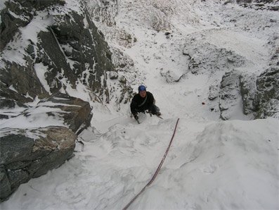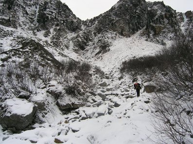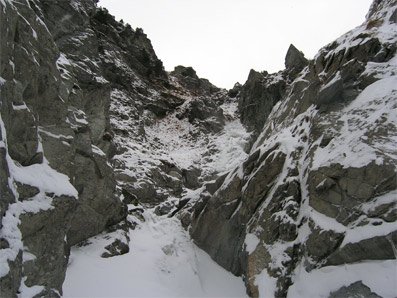 Zuerst über Steilstufe, dann führt leichtes Gelände zu einer Geröllsperre. Über diese in einen Kessel zur nächsten Steilstufe. Nach dieser Stufe (2 SL.) könnte man nach etwa 100m Gehgelände noch eine Stufe anhängen, der Abstieg wird dann aber immer langwieriger.