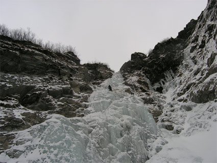 Schöner, leichter und relativ langer Eisfall. Über den Fall könnte sich aber im "worst case" ein Wasserschwall ergießen (Schilder beim Gasthaus). Trotz dieses Umstandes sieht man aber immer Seilschaften im Fall.