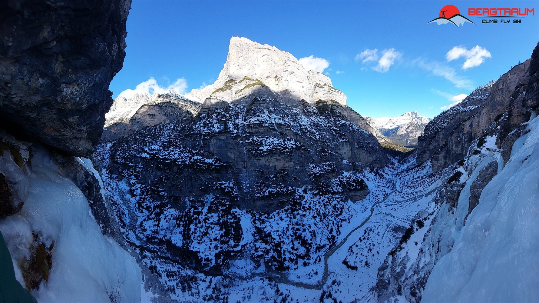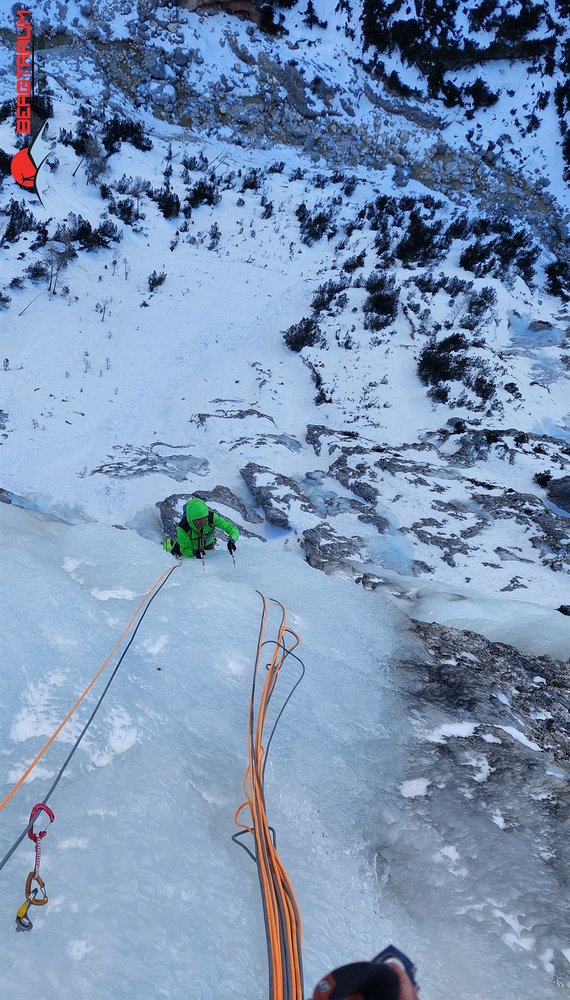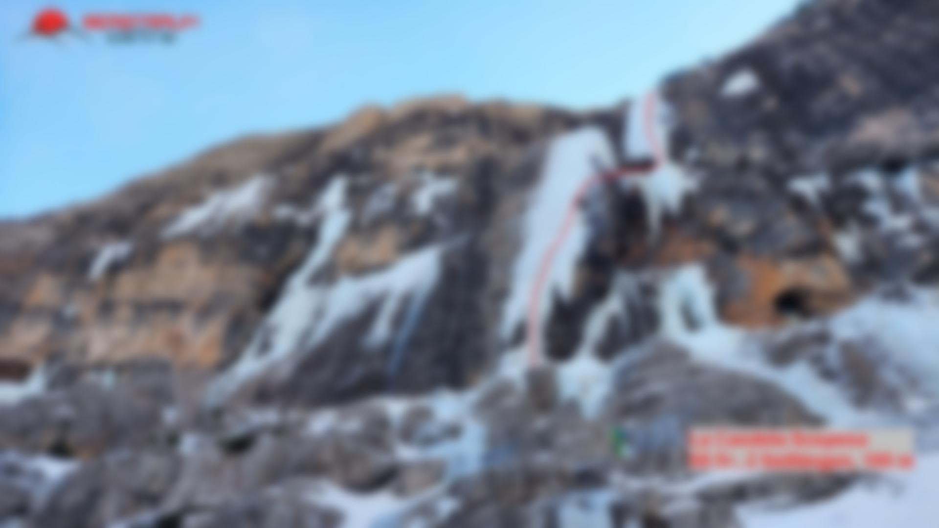 Wunderschöner Eisfall in imposanter Umgebung- Zustieg kann je nach Schneeverhältnissen lang und etwas unbequem sein. Mehrere Möglichkeiten zum Klettern. Ganz links gibt`s die Tour „Cascata di Irene“- WI 5, 180 m und „Cascata di Primavera“- WI 4+ mit rund 130 m Länge.