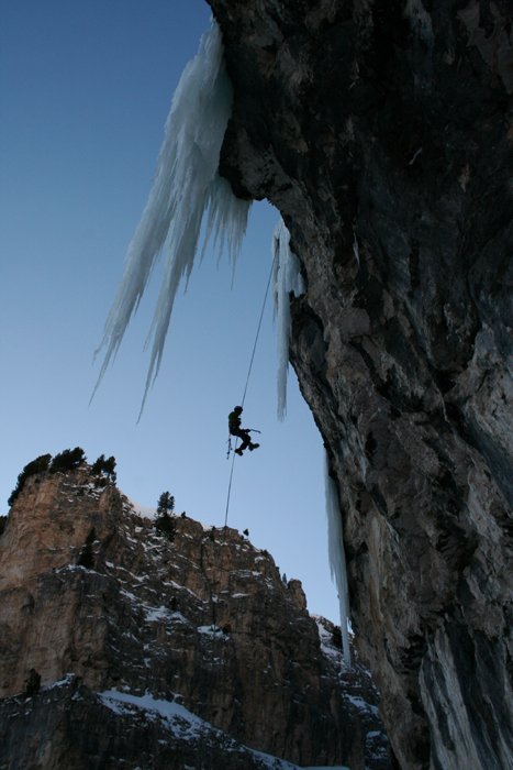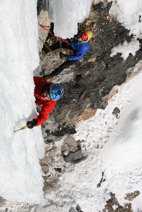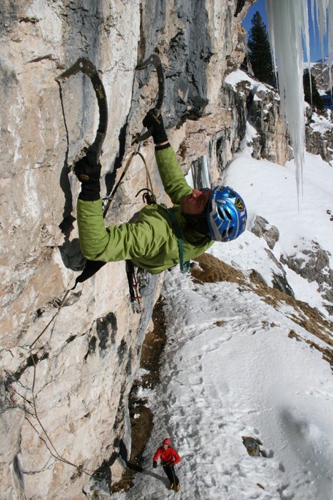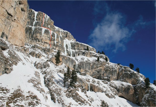Grandiose 5 Seillängen Mixedroute Am 26. Dezember 2008 kletterten die Brüder Martin und Florian Riegler ihre „weise Schwester“ Rotpunkt. Ihre Neutour liegt im Langental bei Gröden (Südtirol). „la sor blanche besteht aus 5 Seillängen Eis und Fels und ist ausschließlich mit Normalhaken und friends abgesichert. Die Schwierigkeiten liegen bei M9 WI 6-.
