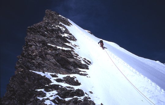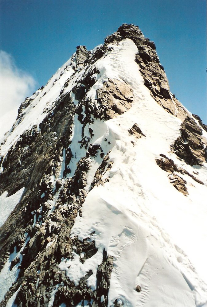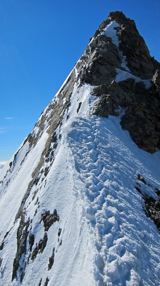 Eiswand von imposantem Aussehen. Wird relativ häufig begangen, von Könnern zuweilen auch mit Skiern abgefahren. Durch die Verbindung mit dem langwierigen Abstieg über das Nadelhorn ein durchaus anspruchsvolles Unternehmen, wobei es von den jeweiligen Verhältnissen abhängt, ob die Eiswand oder der Grat die „Crux“ der Tour bildet. Die Eiswand selbst besitzt eine ziemlich gleichmäßige Neigung von 50 – 55 Grad, eine „Schlüsselstelle“ gibt es nicht. Objektive Gefahren durch Steinschlag sind an sich gering und drohen am ehesten noch im unteren Teil der Eiswand aufgrund von Unachtsamkeiten von Kletterern am Lenzspitze – Nadelhorn Verbindungsgrat. Spaltengefahr ist auf der gesamten Tour kaum gegeben.