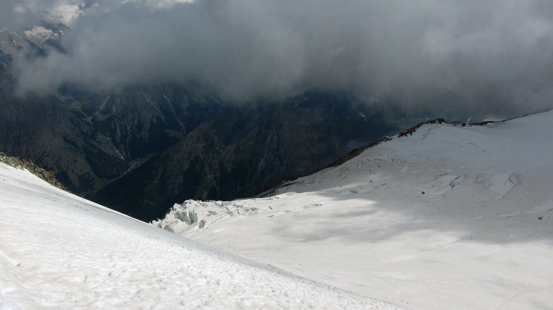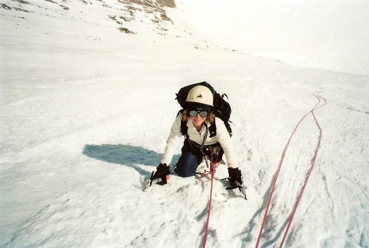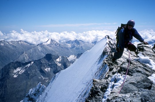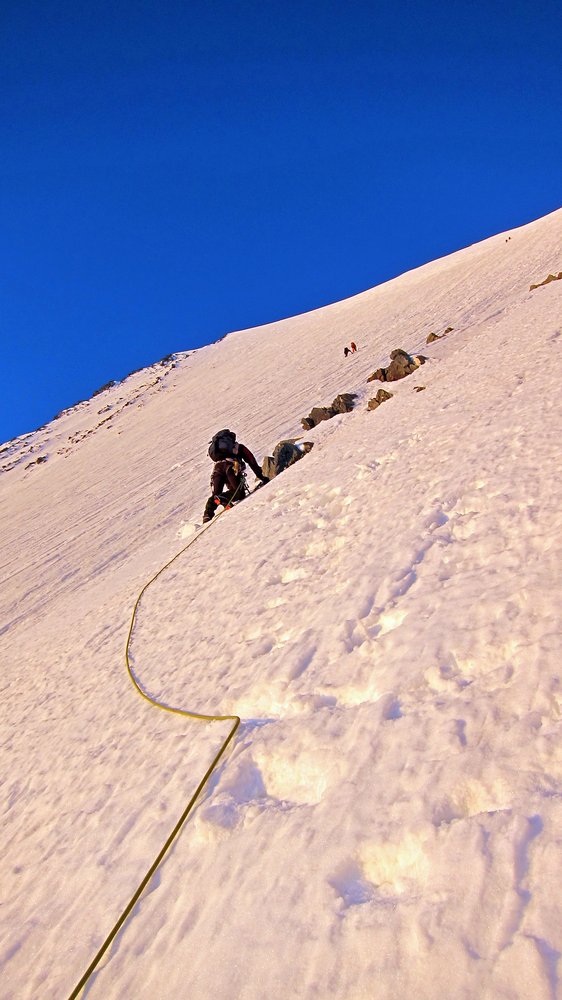 Gletscherausrüstung, Seil (50 m), Eisgeräte, Eisschrauben, Band- und Reepschnurschlingen, eventuell kleines Keilsortiment oder Friends mittlerer Größe (2 1/2, 3).