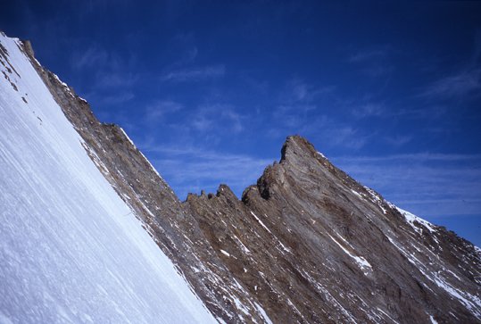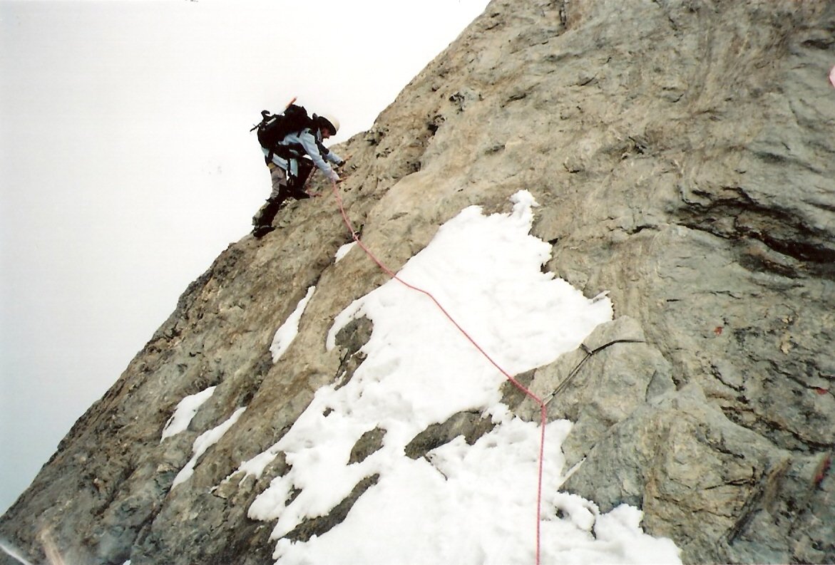 Den Einstieg zur Eiswand bildet der Bergschrund, der auf etwa 3680 Meter erreicht wird. Dieser wird an einer günstigen Stelle (zumeist in Gipfelfalllinie oder etwas weiter rechts davon) überschritten. Nach einer knappen Seillänge erreicht man einen etwa 60/70 Meter hohen Wandabschnitt, der die Begeher aufgrund seiner zunehmenden Ausaperung vor Probleme stellen kann. Die besten Eisverhältnisse sind hier im rechten Wandteil zu finden. Nach Überwindung dieser Passage legt sich die Wand etwas zurück (45 Grad), um in der Folge in konstanter Steigung (50 – 55 Grad) zum Gipfel zu leiten. Sollten keine Steigspuren vorhanden sein, hält man sich am besten in der Gipfelfalllinie oder leicht rechts davon.