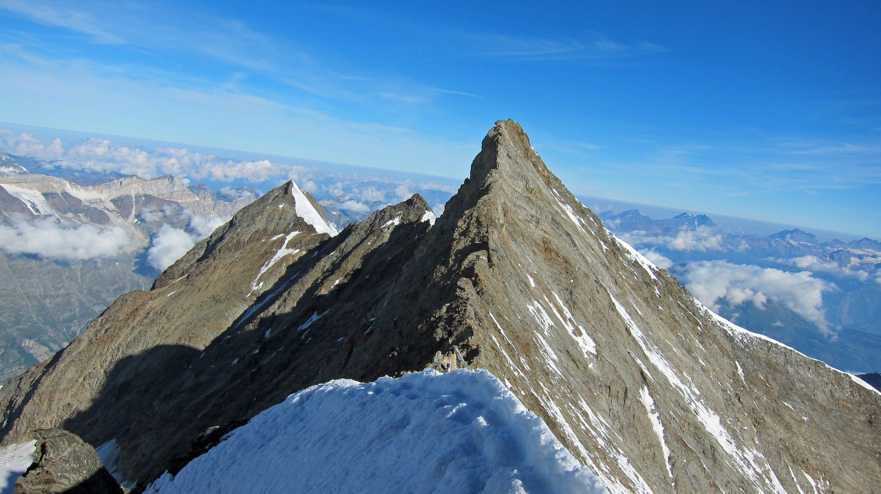 Von der Lenzspitze hält man sich am Grat in nordwestlicher Richtung auf das Nadelhorn zu. Auf 4209 Meter wird das Nadeljoch (auf der Schweizer Landeskarte „Stecknadeljoch“) erreicht. Der Gratabschnitt bietet bis dahin kombinierte Kletterei (Stellen 2 – 3) in ausgesetztem Terrain, das bei Vereisung oder größeren Schneemengen die Kletterer vor ernsthafte Probleme stellen kann. Ab dem Nadeljoch wird der Fels dann zunehmend besser und bietet schließlich schöne Kletterei in gutem Fels (Stellen 3). Allerdings ist die Wegfindung in diesem Abschnitt nicht immer eindeutig, was Aspiranten zuweilen zu Verhauern verleitet hat. Eine detaillierte und leicht nachvollziehbare Beschreibung zur Wegfindung auf diesem Gratabschnitt findet sich jedoch im Buch von Richard Goedeke „4000er. Die Normalwege“. Der Abstieg vom Nadelhorn (4327 Meter) gestaltet sich in der Regel problemlos. Man steigt zuerst durch leichtes Kombigelände (1) steil ab und hält sich in der Folge am deutlich ausgeprägten Grat in Richtung Nordosten auf das Windjoch (3850 Meter) zu. Kurz vor Erreichen des Windjochs mündet rechts der Gletscherweg vom Hohbalmgletscher her ein, den man hinunter ins Gletscherbecken folgt, wo schließlich wieder der Zustiegsweg erreicht wird.