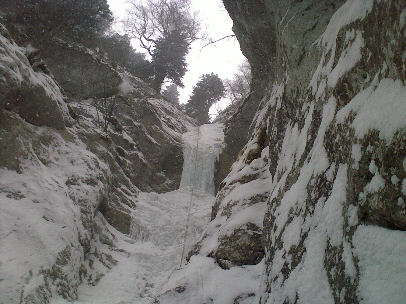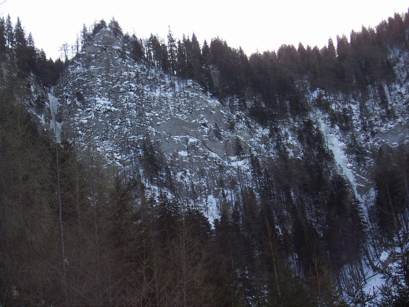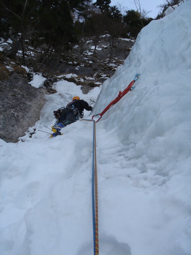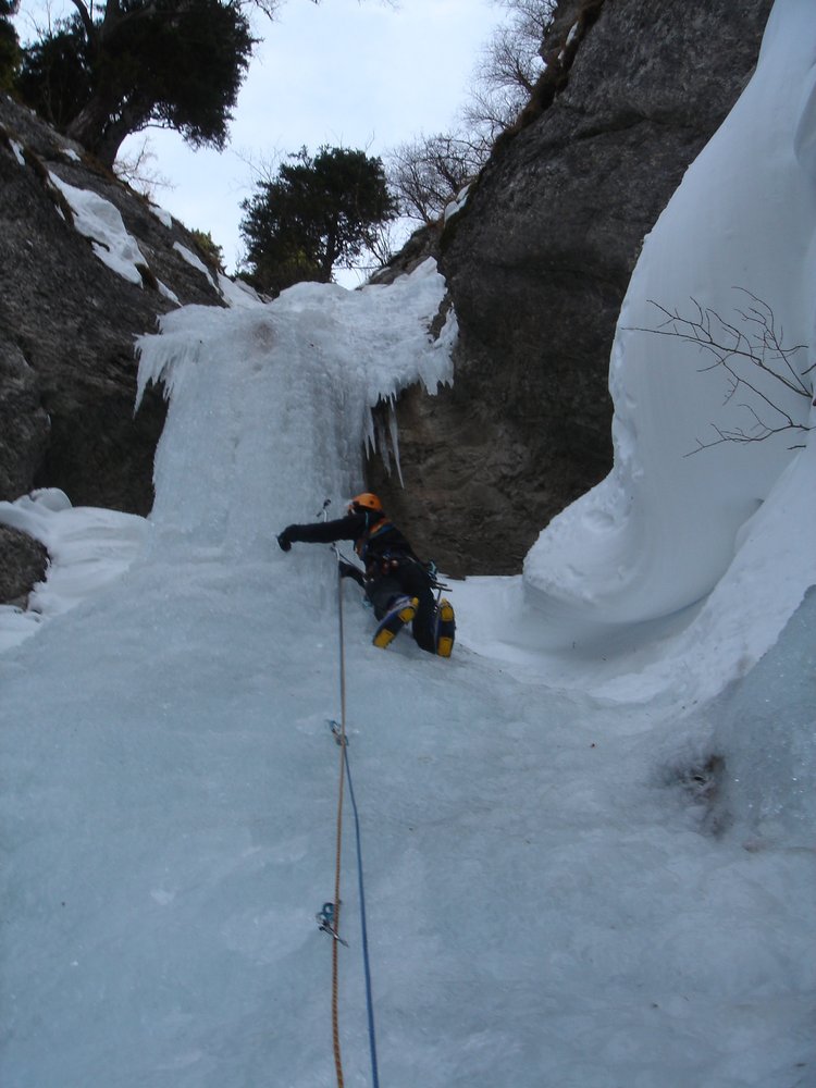 Dieser Fall ist etwas schwerer als der rechte Gamseckfall (Nr. 1). Die letzte Seillaenge ist ein Eisvorhang mit anschliessendem delikaten Ausstieg, der kaum gesichert werden kann. Also etwas fuer den fortgeschrittenen Kletterer (der bei Nr. 1 keine Probleme hat).