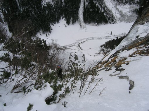 Zuerst oben, von unten gesehen, nach rechts, dann an Bäumen abseilen (siehe Topo)