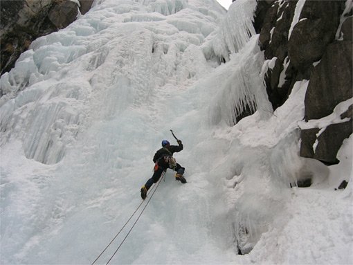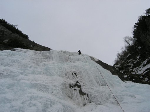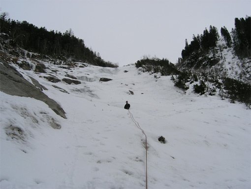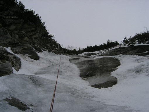 Guter Eisfall in einer Lawinenrinne unterhalb der Köpflalm. Der Fall ist nur nach längeren Kälteperioden zu empfehlen.
