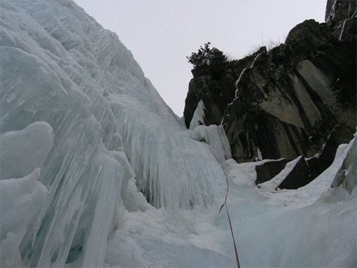 Von der Straße durch die Rinne zum gut sichbaren Eisfall aufsteigen.