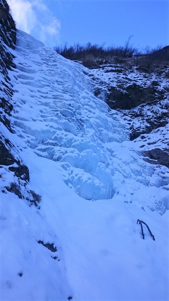 chfall kein durchgehender Eisfall im eigentlichen Sinn, sondern führt durch eine Rinne bzw. Schlucht. Dadurch wechseln Gehpassagen und Eisaufschwünge ständig einander ab. Dabei legt er jedoch eine beachtliche Strecke über insgesamt 400 Hm zurück, so dass der Eisfall trotz der Gehpassagen und der vergleichsweise geringen Schwierigkeiten nicht zu unterschätzen ist.