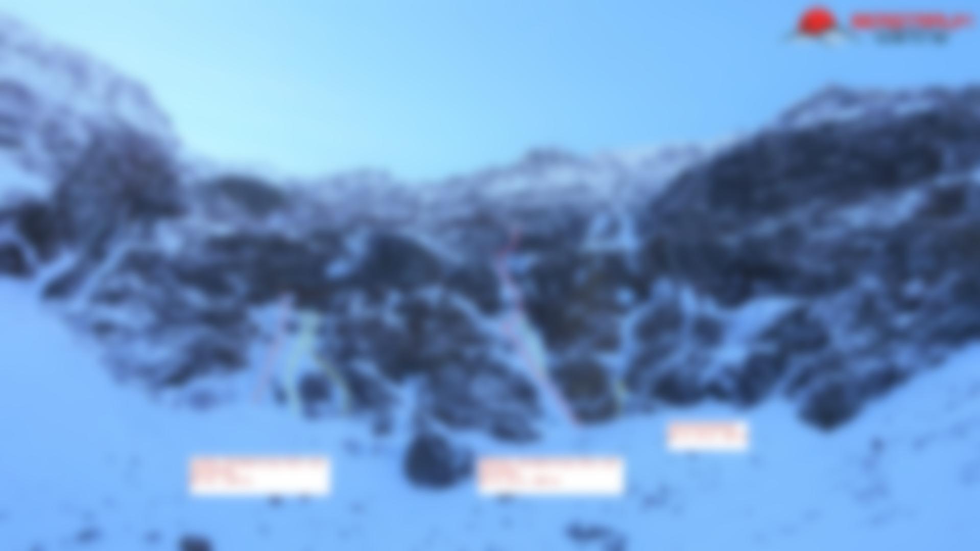 Der rechte Fall führt in eindeutiger Linie nach oben. Die letzte Länge oft sehr wenig Eis bzw. herausfordernd steile und schwere Mixedlänge bis zum Ausstieg. 1. SL, 30 m, WI3; 2. SL, 50 m, WI3; 3. SL, 30 m, WI6-; 4. SL, 60 m, WI4+; 5. SL, 40 m, WI 6, M6.