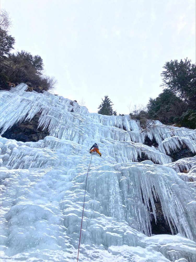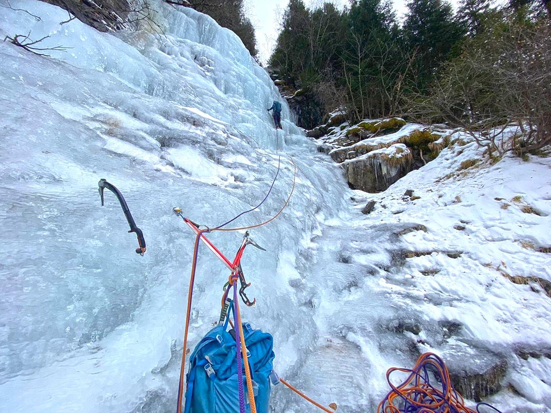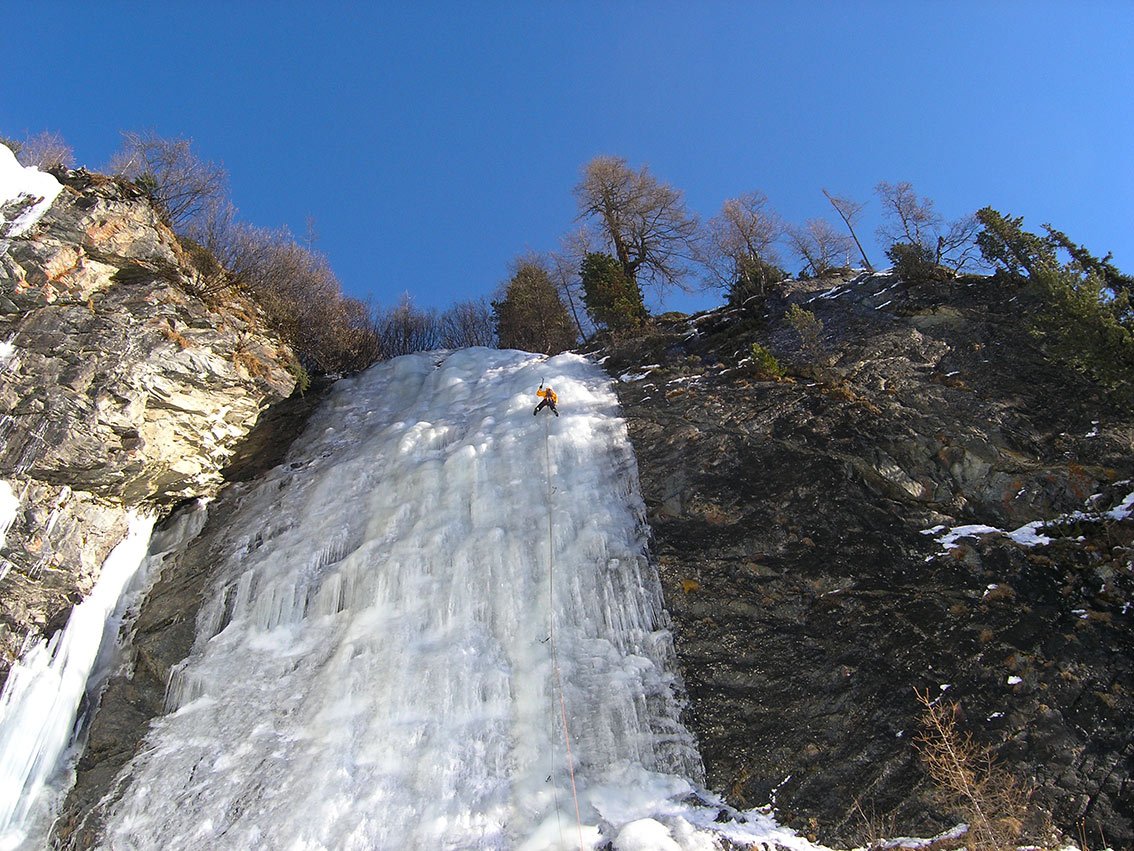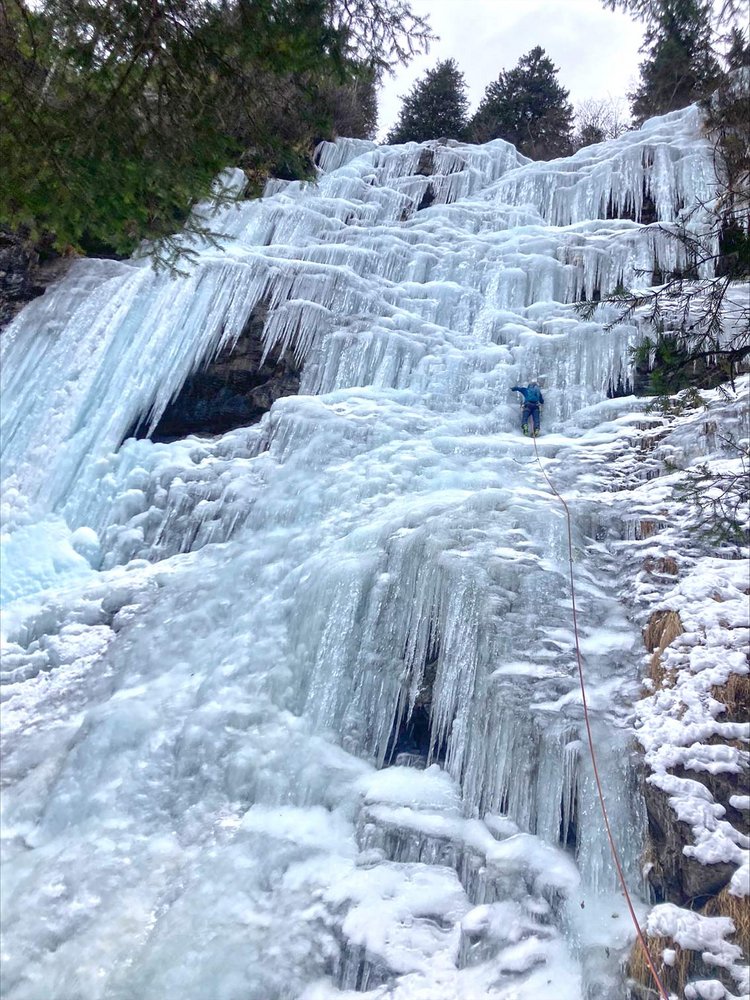 Langer Eisfall mit vielen Varianten direkt im Ort - deshalb stark von Kursen frequentiert.