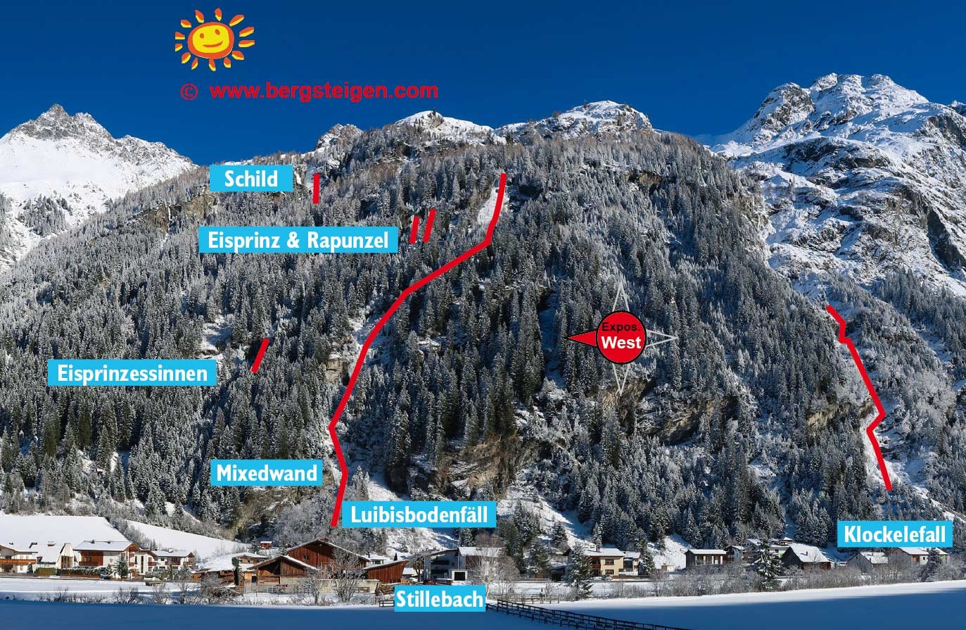 Der Luibisbodenfall ist ein sehr guter, langer Eisfall, der im Verlauf auch Gehpassagen hat, man kann fast nach jeder Stufe abbrechen. Der Hauptfall wird sehr gerne von Kursen besucht und ist an schönen Sonntagen meist überfüllt – Eisschlag! Es gibt links vom Hauptfall div. Varianten (siehe Übersichtsbild).
