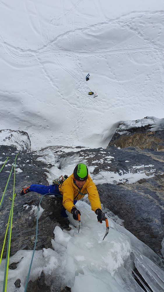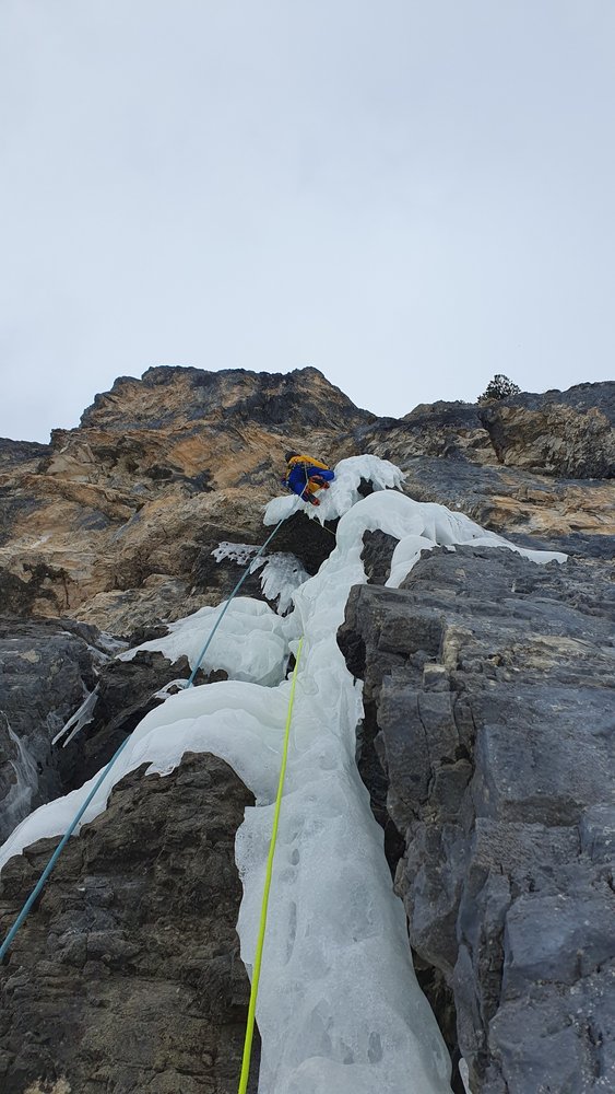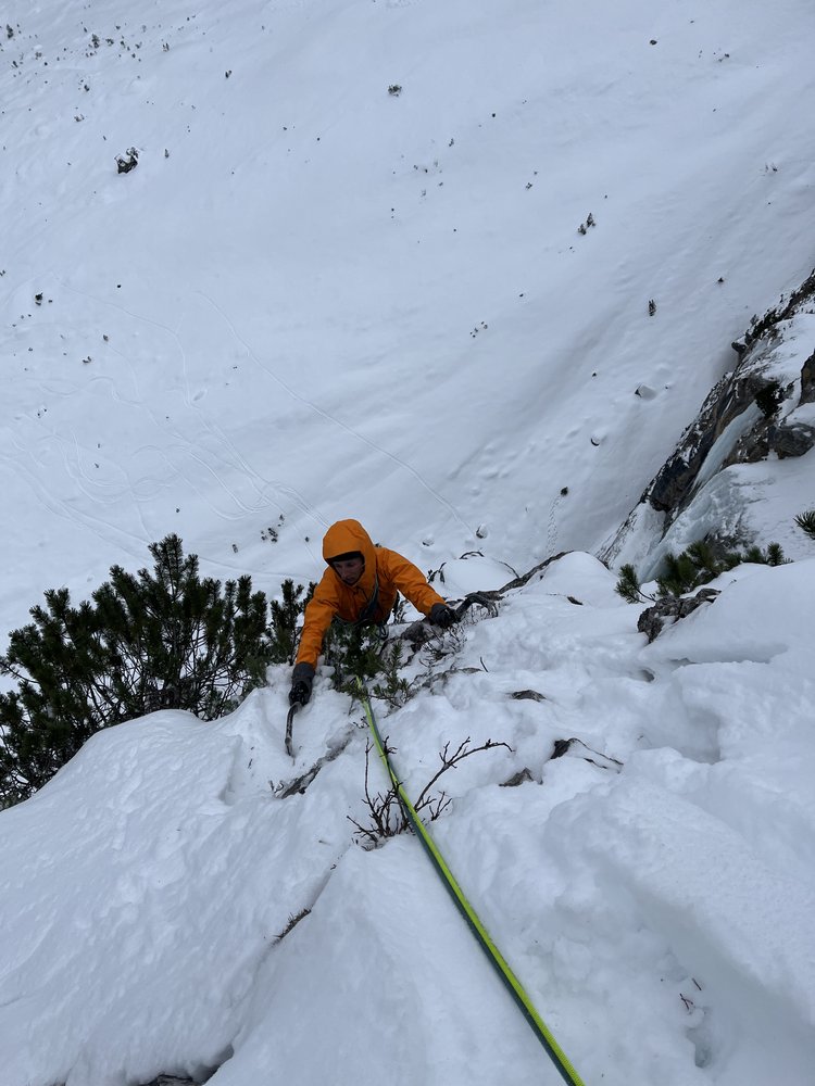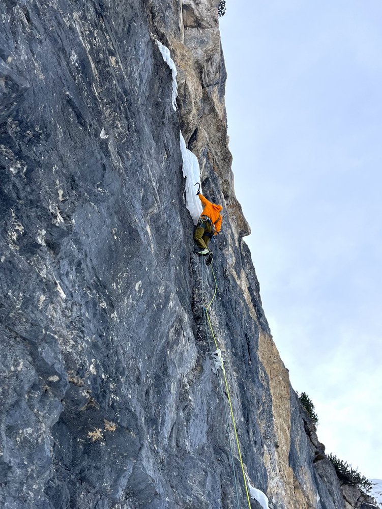 Beim ersten Versuch am 27.01.2022 wurde das erste Eis erst nach 40 m erreicht, bei der Erstbegehung am 22.01.2024 ca. 10 m früher. Ein paar Wochen früher war sogar noch mehr und besseres Eis in der Route.