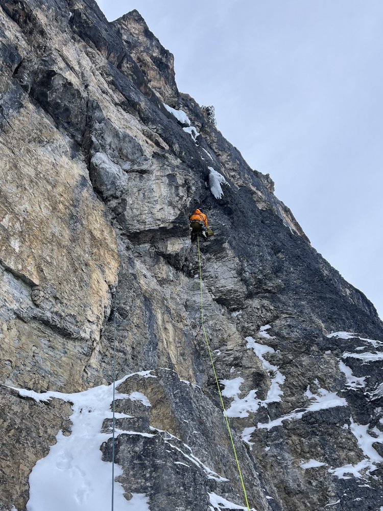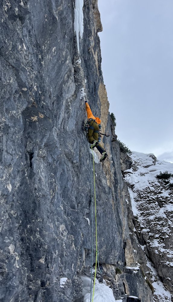 So symbolhaft die (zwanghaft) alle möglichen Zapfen kombinierende Linienführung dieser Route für Erstbegehungen neuerer Zeit steht, so entgegen dem Zeitgeist ist der Stil, in dem sie geklettert wurde: auf 170 m gibt es inklusive der Standplätze 2 fixe Schlaghaken, ein weiterer Pecker wurde im Vorstieg geschlagen und vom Nachsteiger wieder entfernt. Der Rest wurde ausschließlich mit Cams gesichert. 2022 begonnen, hat sich unserer Geduld und unser Glaube an diese Linie 2024 ausgezahlt. Kein schneller Konsum, kein schnelles, aber erfolgsicherndes totbohren, es muss auf den richtigen Moment, Partner und Verhältnisse gewartet und viel alpine Erfahrung mitgebracht werden. Die Route darf als traditionelle Antwort auf die aktuelle Entwicklung und gleichzeitig als Hommage an die Ursprünge des Mixed-Kletterns im Pinnistal verstanden werden.