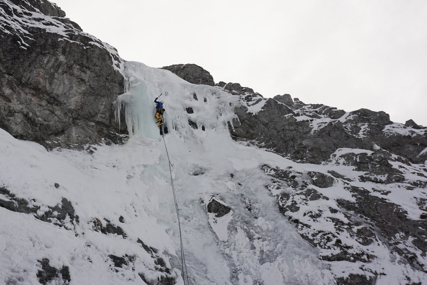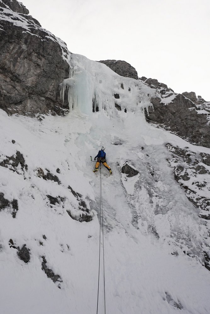 Im unterem Teil ca. 15 m WI 4. Wir kletterten aufgrund der besseren Eisqualität danach die senkrechte, breite Säule im linken Bereich. Bei guter Eisqualität sollte der Anstieg rechts davon etwas leichter sein (~WI5-).