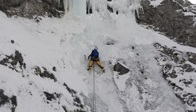 Schöner Eisfall mit einer kräftigen Passage in der breiten Säule.