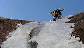 Bei wenig Schnee ist am Anfang der Wand ein kleiner Eisschlauch mit ca. 50° zu klettern.