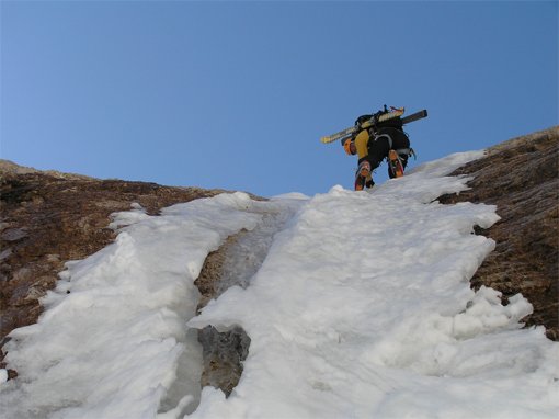 Bei wenig Schnee ist am Anfang der Wand ein kleiner Eisschlauch mit ca. 50° zu klettern.
