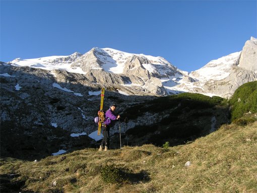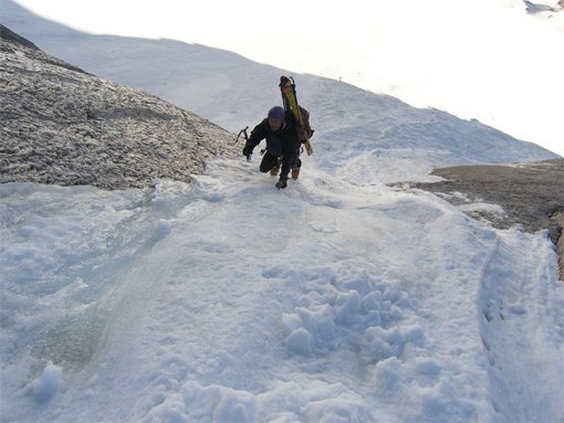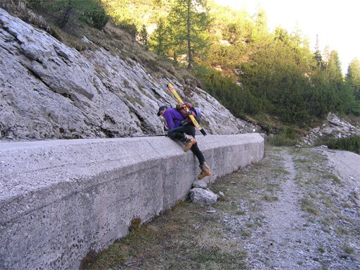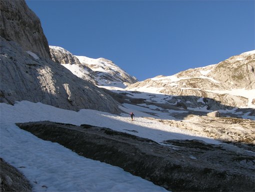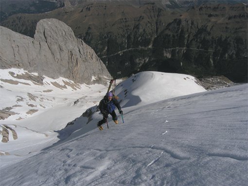 Wenn in der Engstelle am Einstieg kein Eis oder Schnee mehr ist, können Kletterstellen bis zum 4ten Grad auftreten (ungute Platten, also besser die Wand vorher von der Fedaiapassstraße mit dem Fernglas erkunden).